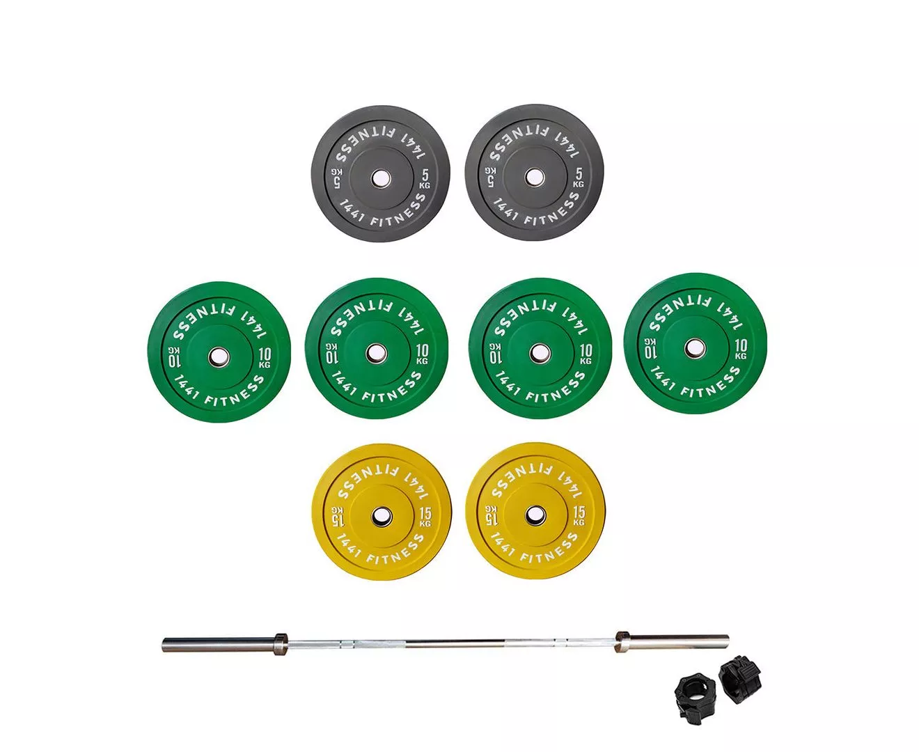 The 1441 Fitness 100 Kg Olympic Rubber Bumper Plates with Barbell is designed to work out the whole body, from legs and back when squatting to arms and abdominal when performing chest press.