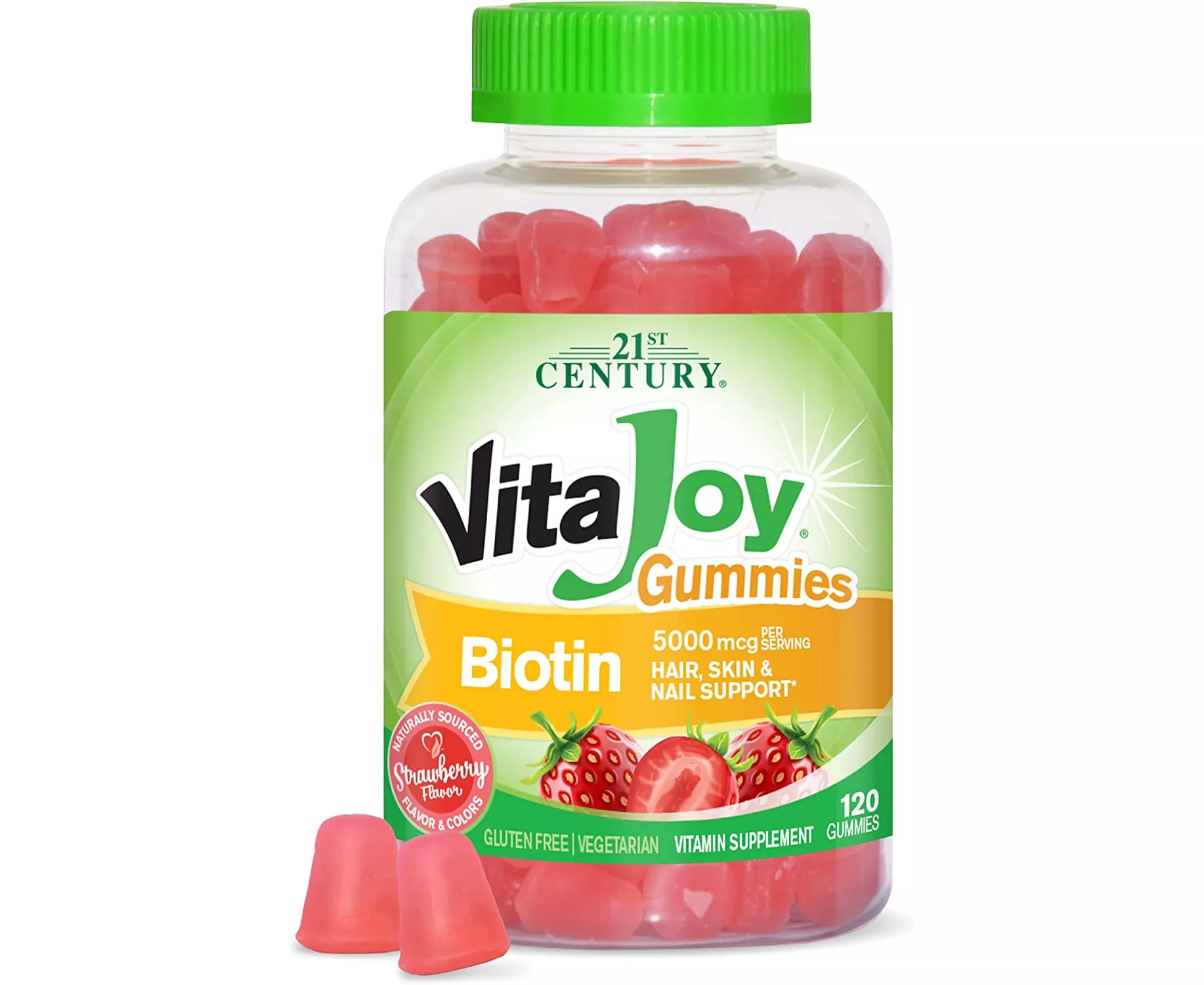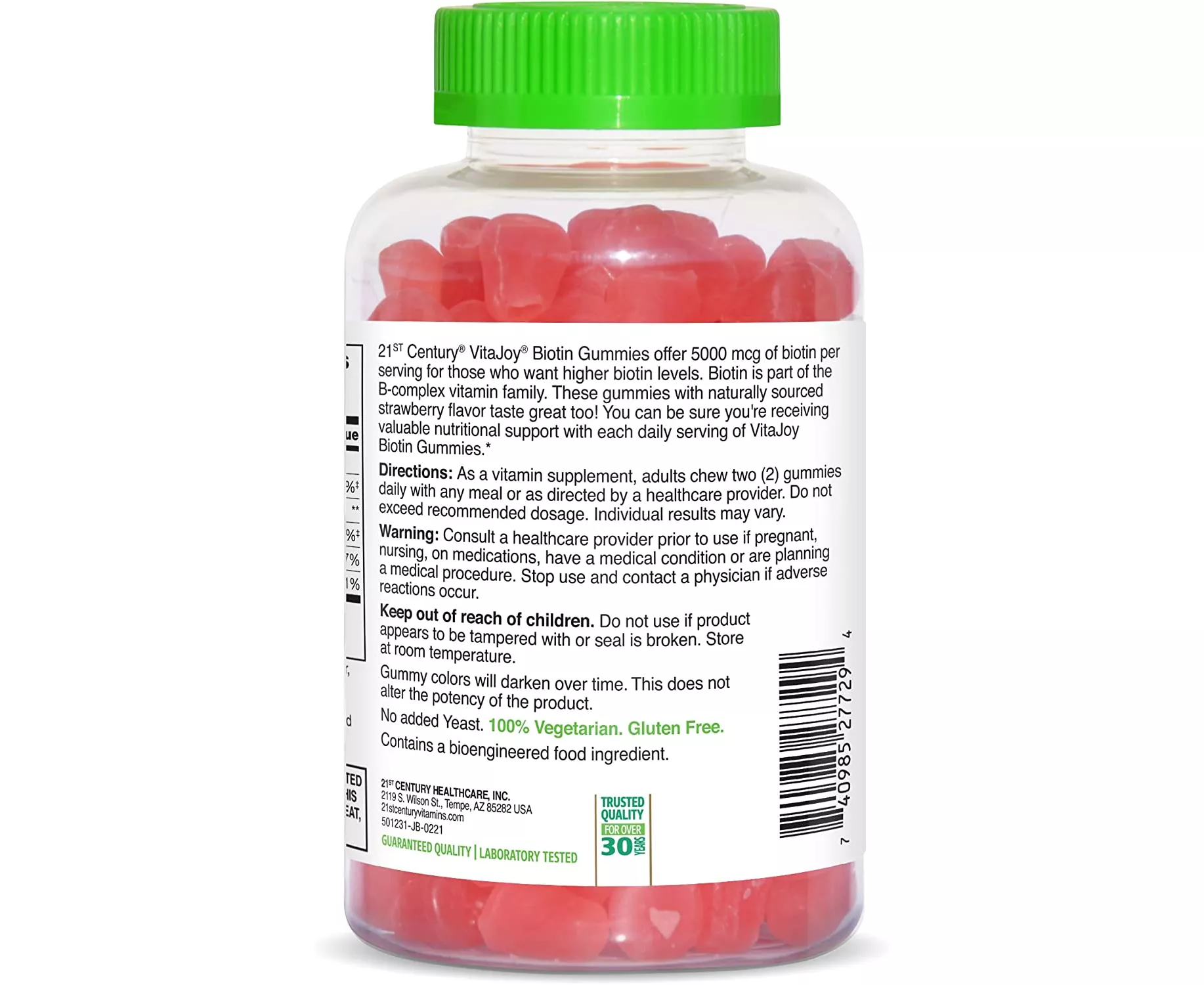 21st Century VitaJoy Biotin Gummies provide an essential nutrient necessary for the normal metabolism of carbohydrates, proteins and fats. Biotin also supports healthy hair, skin and nails. These gummies with naturally sourced strawberry flavor taste great too. You can be sure of receiving valuable nutritional support with each daily serving of VitaJoy Biotin Gummies. 100 Percent vegetarian vitamin supplement Super Potency.