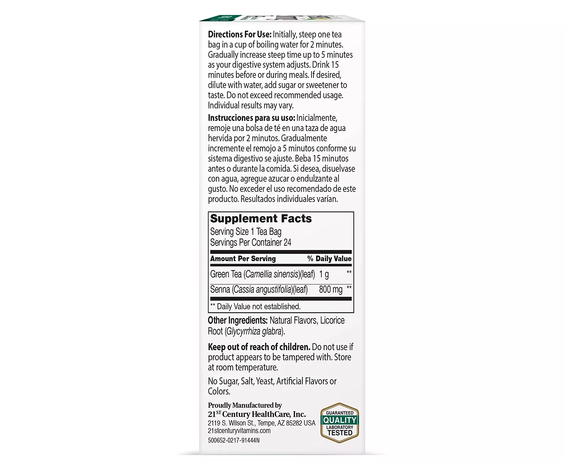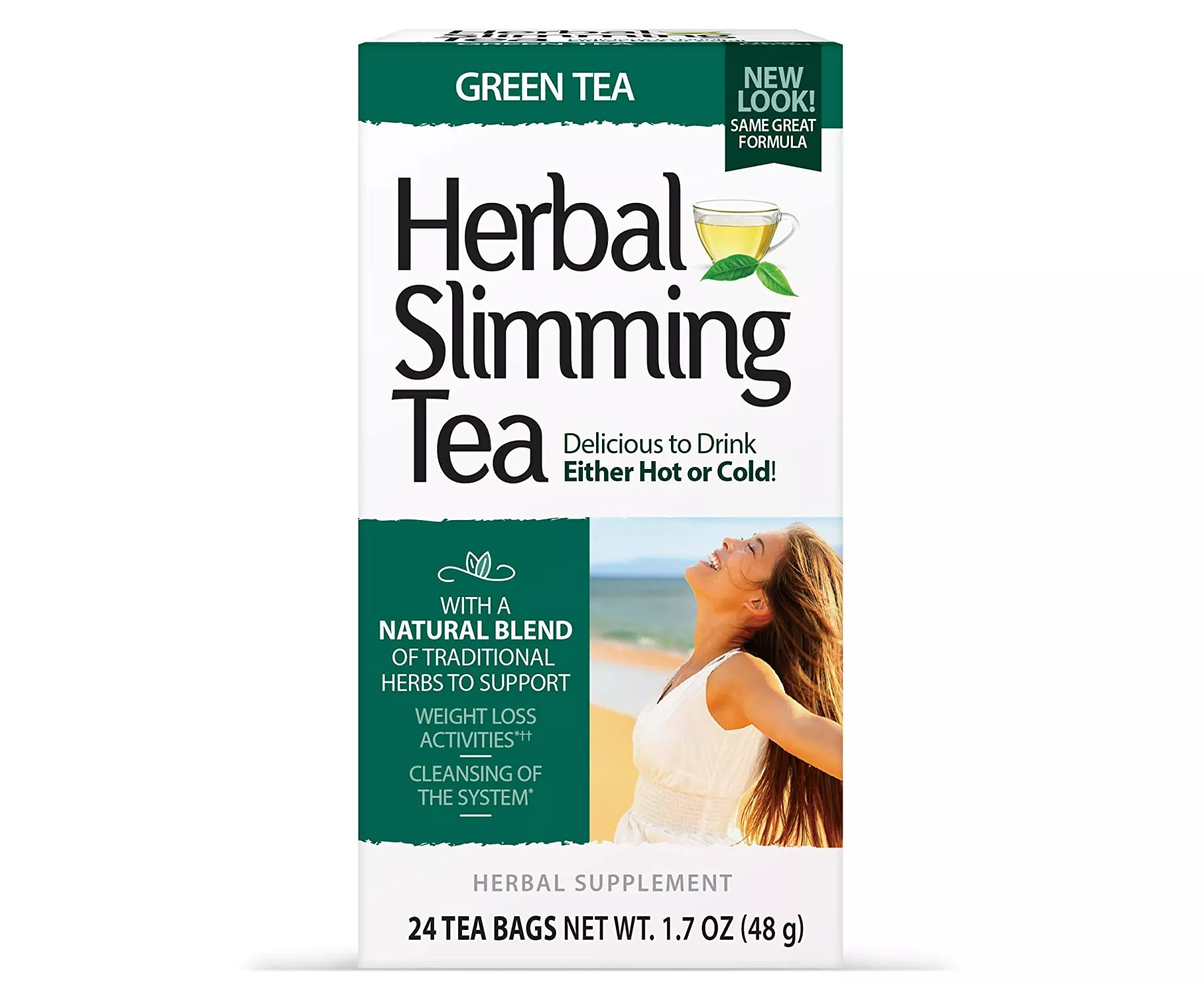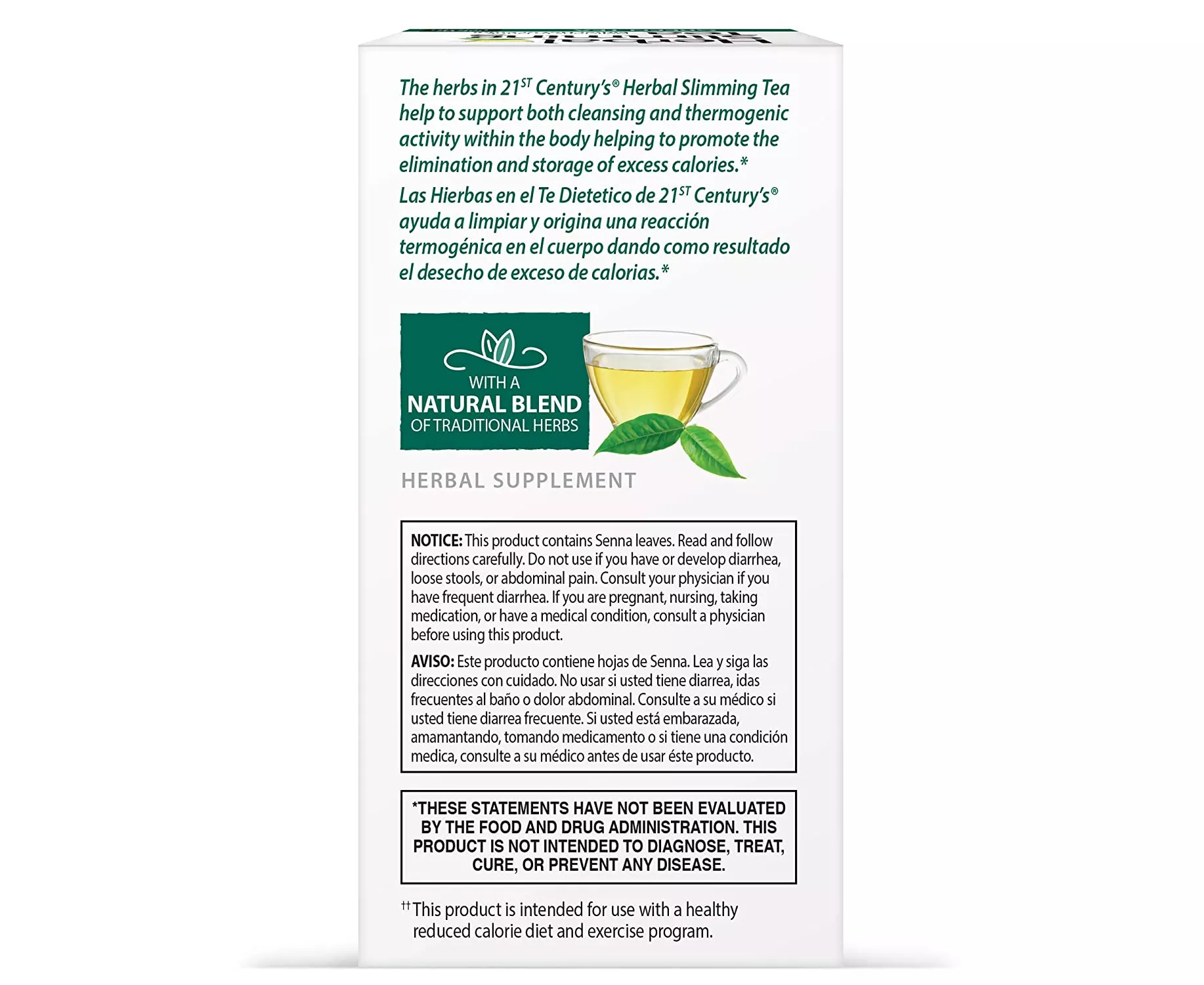 The herbs in 21st Century's® Herbal Slimming Tea helps to support both cleansing and thermogenic activity within the body helping to promote the elimination and storage of excess calories. This product is intended for use with a healthy reduced calorie diet and exercise program.