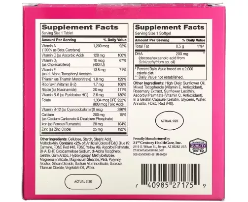 Clinical studies have shown that taking 200mg of DHA during pregnancy and while nursing a child can provide significant support in the healthy development of brain and eye function. In fact, many doctors specifically recommend that pregnant women and nursing mothers take a multivitamin and consume 200mg of DHA per day to help their baby develop during these important times. The unique DHA in 21st Century Prenatal Multivitamin + DHA is a patented, ultra-pure and completely fish-free DHA to support your babys healthy brain and eye development.