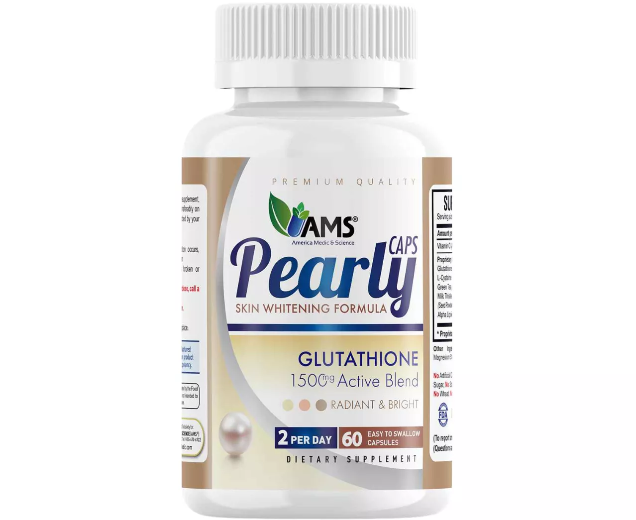AMS® Pearly Caps is a dietary supplement that improves the appearance of your skin by acting on brightening and unifying the skin tone. Also it works on clarifying the skin from any impurities. AMS® Pearly Caps contains Glutathione which acts to regulate Melanin concentration in the skin. Glutathione and other natural ingredients in AMS® Pearly Caps will help you to gain the skin’s freshness, radiance and attractiveness you are looking for. This formulation helps fade hyperpigmentation and dark spots.