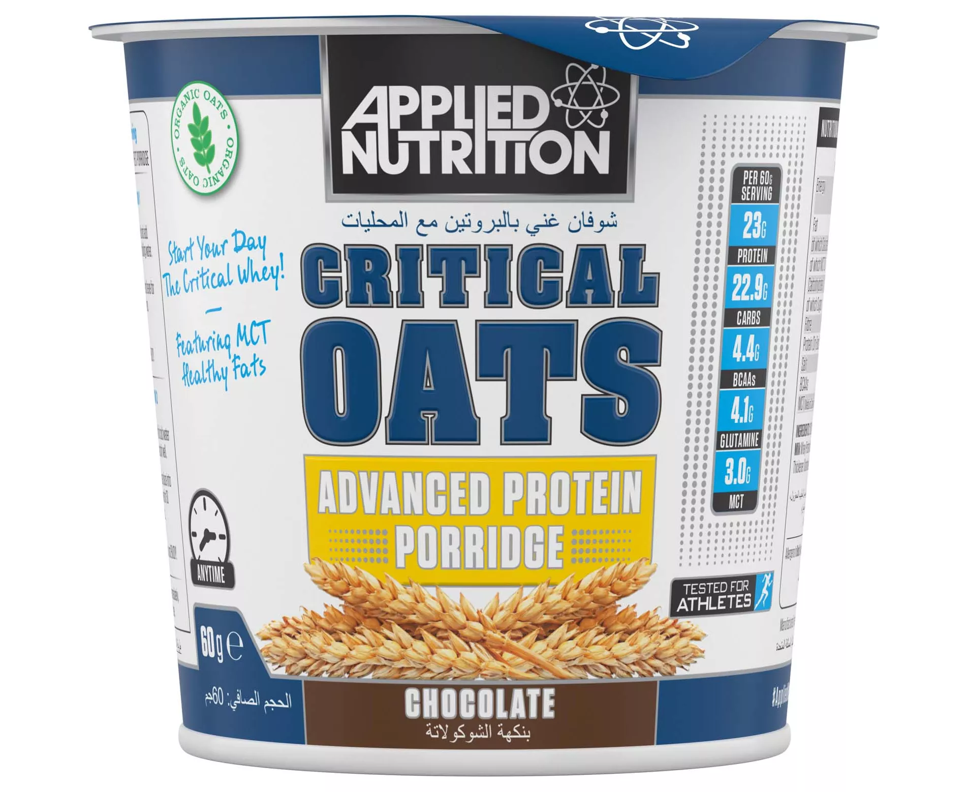 Applied Nutrition Critical Oats Protein Porridge is Oats Protein Vital Oats Organic Whole Oats + Whey Protein (Whey Protein) from Brandblade Nutrition International is a premium quality protein primarily because it contains 23 grams of whey protein and is fortified with muscle-building amino acids. It can be used as a delicious breakfast or as a snack between main meals. A healthy, satisfying, delicious, and integrated meal that is beneficial to the body and is very important, especially during periods of diet for everyone who suffers from hunger, which causes diet failure and cannot be dispensed with by bodybuilders. Mix it with hot or cold milk or water. Produced under GMP Good Manufacturing Practices to ensure the highest quality.