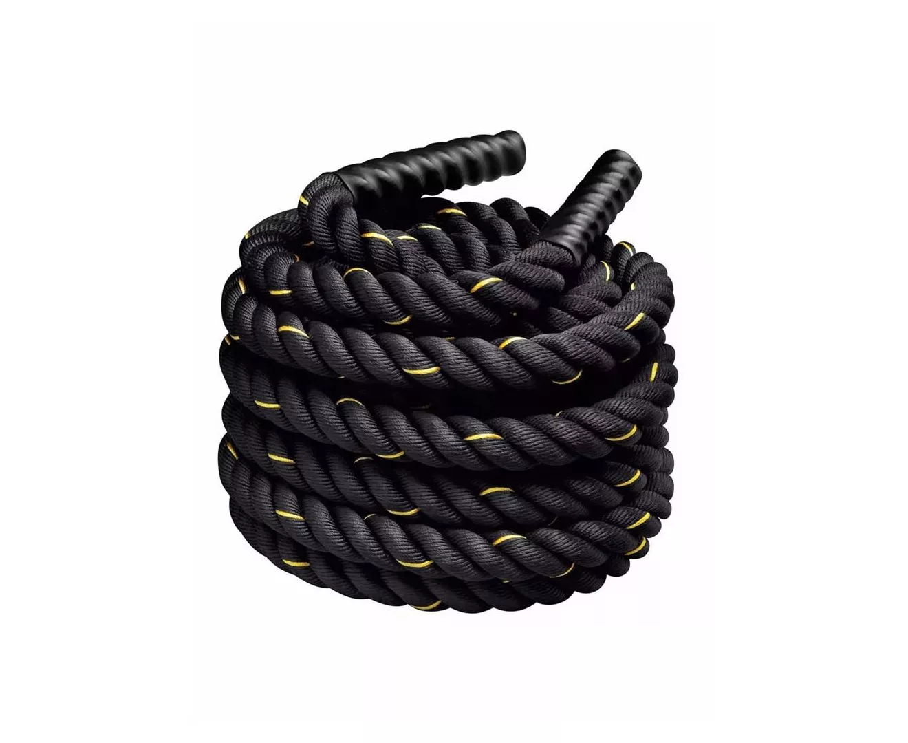 The Battling Rope is made through a special double-braiding process that creates an soft and extremely strong rope. They are built to withstand rigorous use and will last for years to come. They are very comfortable to hold onto and will not shed, making them ideal to use indoors or outdoors. They have an excellent strength ratio and are heavy ropes to use. They also have a high abrasion resistance and due to them being double-braided, they won't stretch like some 3-strand nylon or poly ropes. Like all our battling/fitness ropes, they come standard with heavy-duty vinyl handles on both ends.