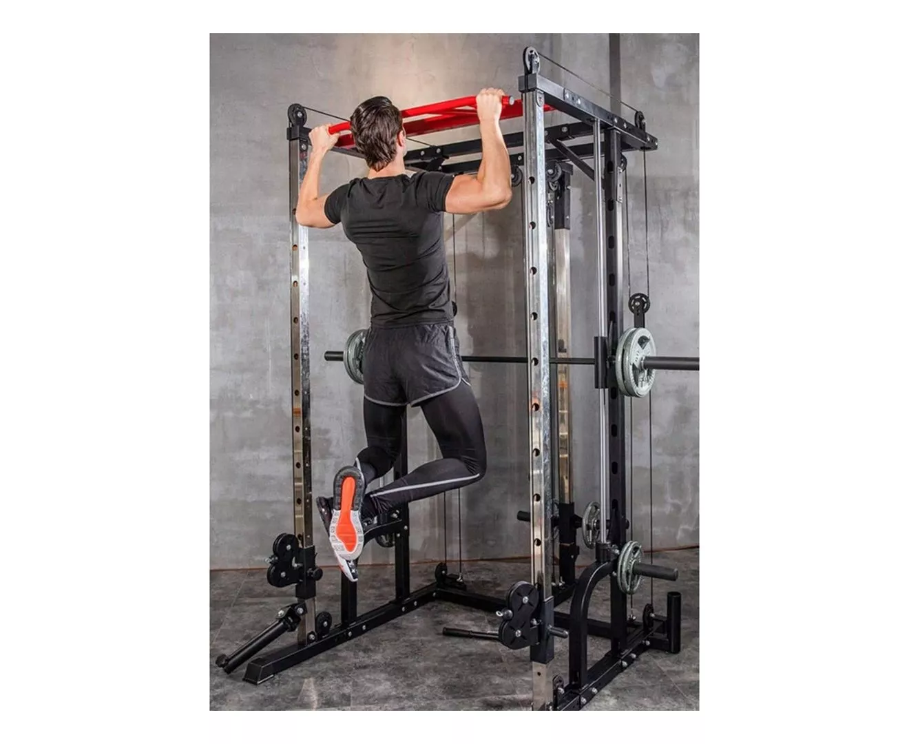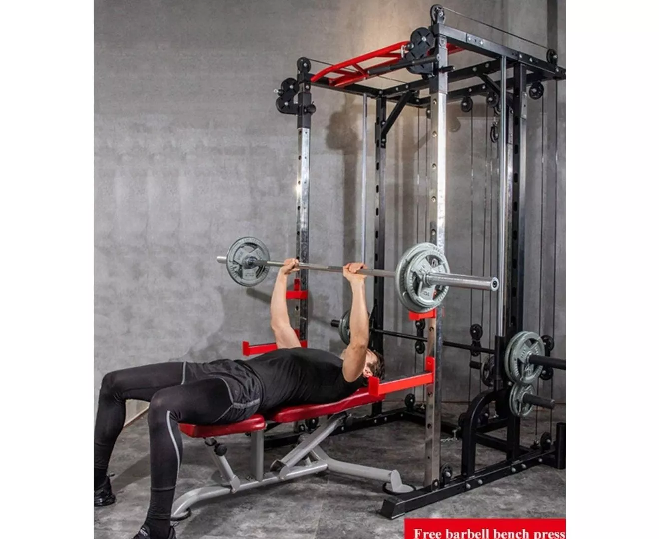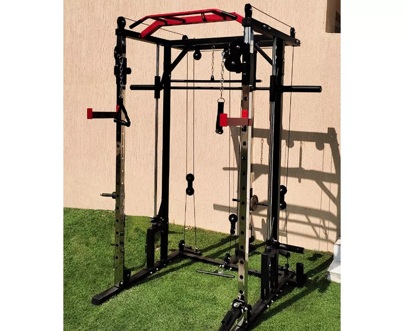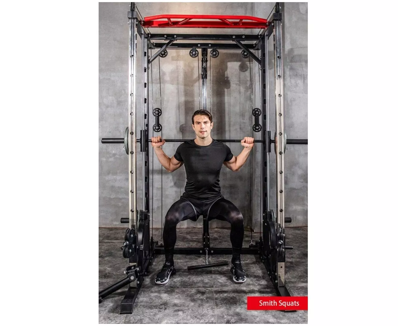1441 Fitness All in One Heavy Duty Multifunctional Unisex Smith Machine Cage System with Cable Crossover, Customizable Training Station Equipment for Workout Weight Lifting & Home Gym Training. Inside of a smith machine, you do not need to worry about balancing or stabilizing the bar. This can be an advantage since you are able to put all of your focus into contracting the target muscles. The Smith Machine is a great piece of exercise equipment to use when you want to focus on one muscle group. If you are used to training with free weights and find there is an imbalance in muscle growth, the Smith Machine can help you target a specific muscle so that it will catch up with the rest of the muscle. Using a new exercise or piece of equipment is an excellent way to freshen up a boring routine or to simply present your chest muscles with a different stimulus for growth. One exercise that steers clear of the usual flat bench press and dumbbell flies, even though these are great, is the decline smith machine press. 1441 Fitness Heavy Duty Smith Machine with Cable Crossover is the complete All-In-One Machine you need at your home or building's gym to fulfil your fitness goals and do unlimited numbers of exercises which includes Smith Machine, Cables Crossover, Squats, Pull-ups, Triceps pulldown, Biceps, Lats pull-down, Incline/flat/decline Bench pressing, Shoulder Press, Back Rows and absolutely all the muscles you need to train! The maximum weight load is 300 Kg and Height 220 CM. Leg Press Board Attachment to the Smith Machine Barbell can be added as well so you can train your quads do! Never skip leg day!