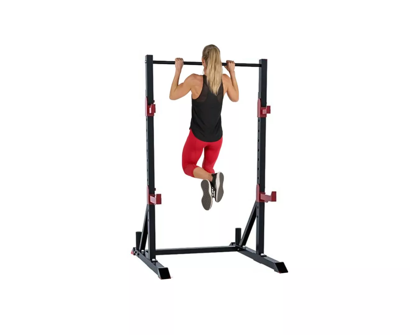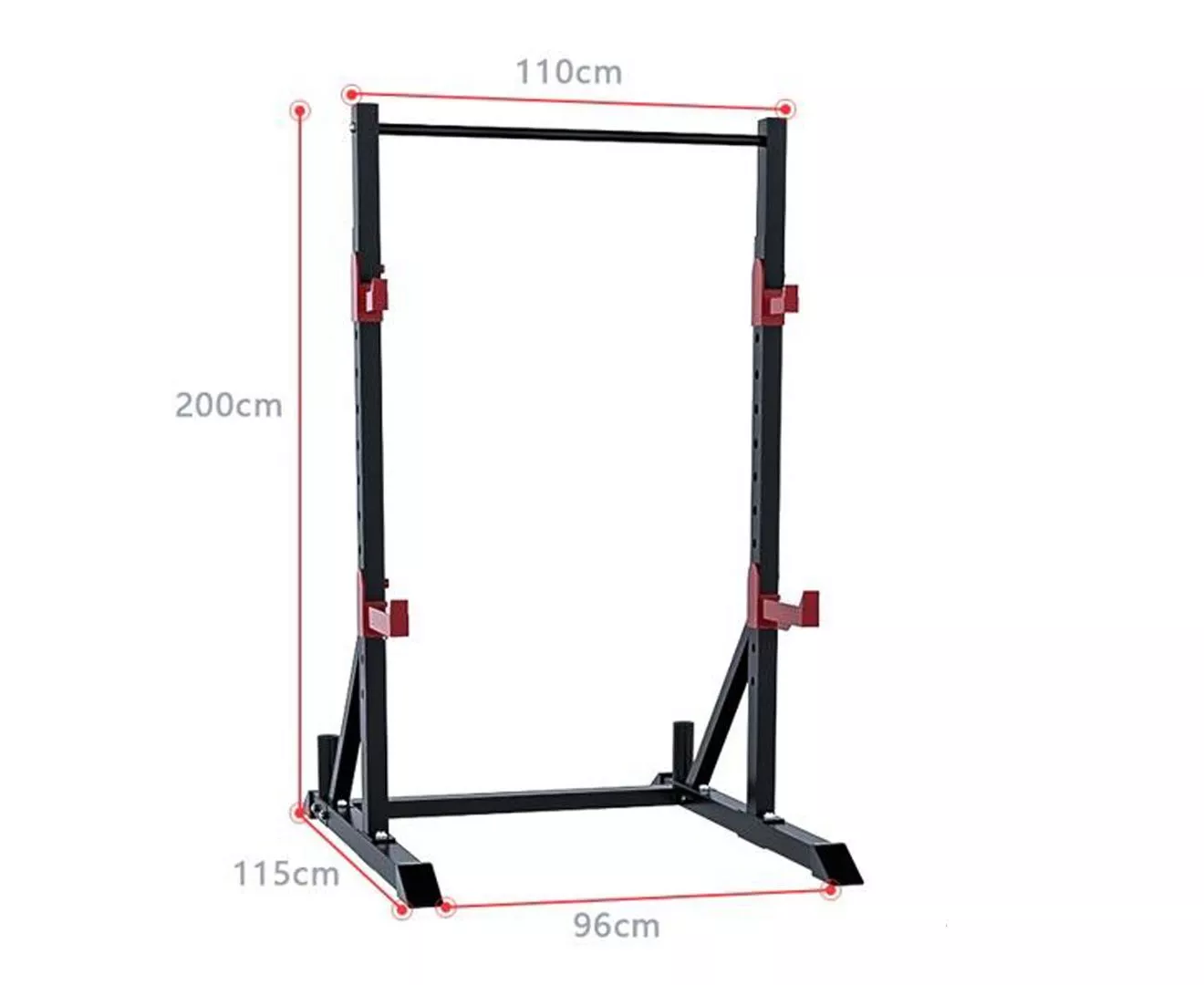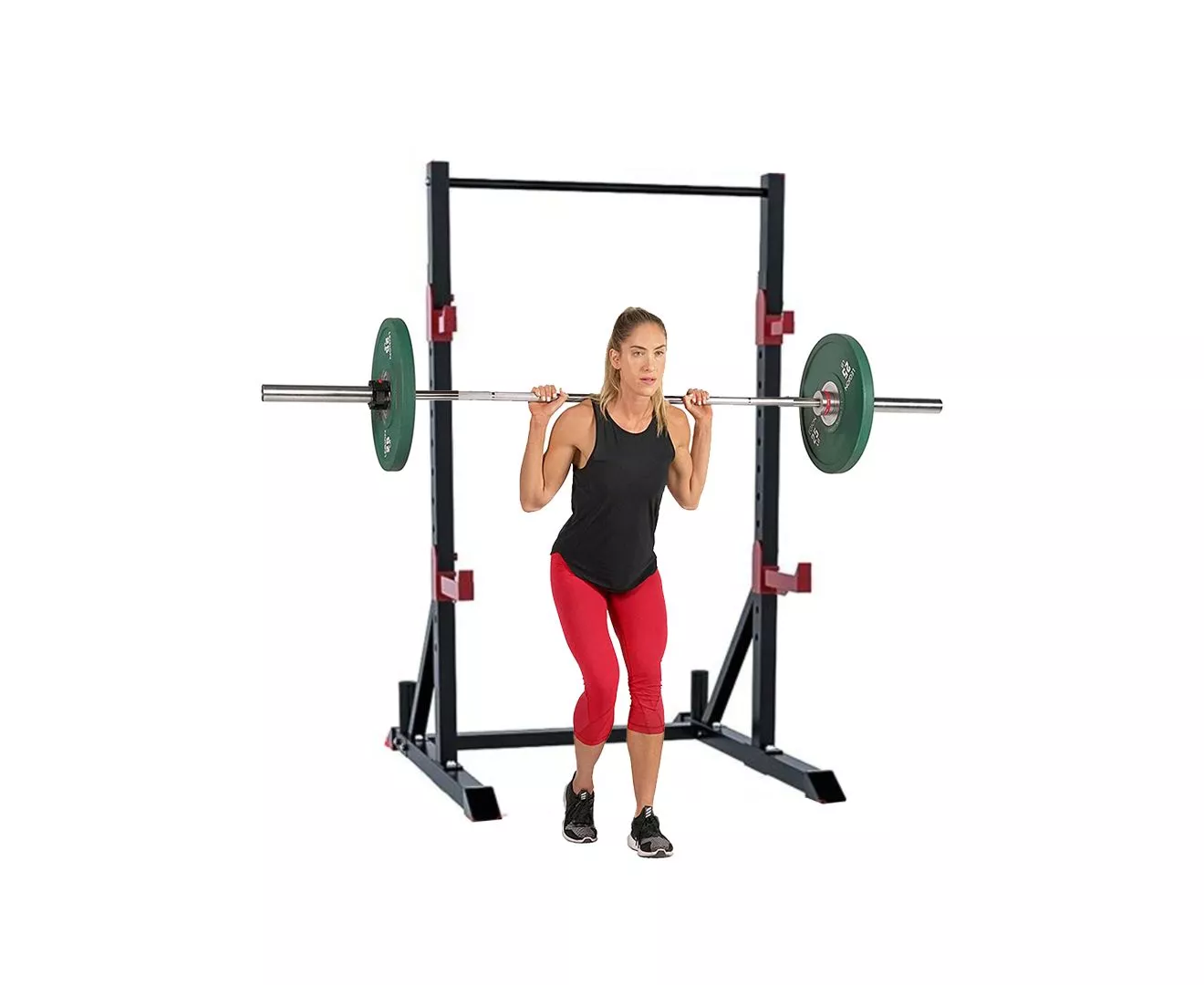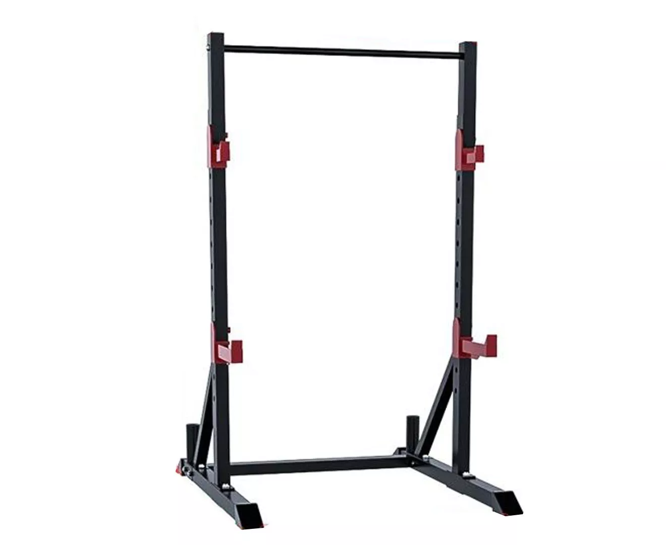 1441 Fitness Multi-Functional Squat Rack & Adjustable Power Rack with Two J-Cups Barbell Rack Dip Stand Weight Lifting Accessories for Home & Gym, Weight Capacity - 500 LBS - Black. The capacity of this squat rack is 500 pounds. More than just a place to set up your bar, our Squat Rack accomplishes a lot more. It comes with two sets of safety arms as well as two J-cups that may be adjusted to the ideal height. It also has two 12-inch poles for bumper plates and storage. It also has a pull-up bar for doing pull-ups. This squat rack has a pull-up bar, safety arms, and plate storage posts. The first and most obvious benefit is that they save space, Squat racks that fold up are a great way to save room in your garage or gym without losing quality. A foldable squat rack or power rack is "more adaptable than most standard squat racks," adding that good quality folding squat racks allow you to do way more than you do. Adding squats to your workouts can help boost your exercise performance, decrease your risk of injury, and keep you moving more easily throughout the day. But these are just a few of the benefits.