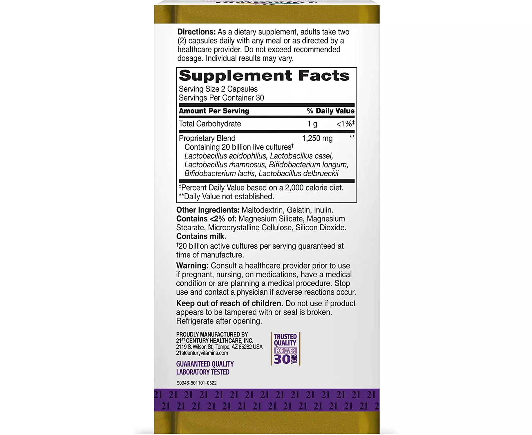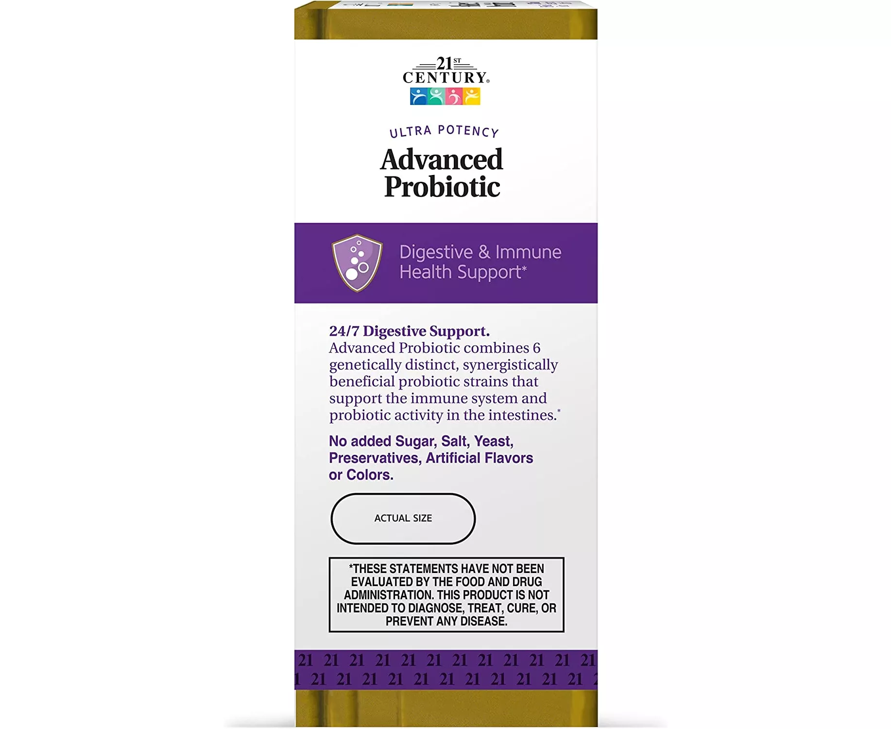 21st Century Advanced Probiotic synergistically combines 6 genetically distinct and beneficial probiotic strains and the prebiotic Inulin to support probiotic activity in the intestines. 21st Century offers the highest quality ingredients produced to strict standards for support of your good health.