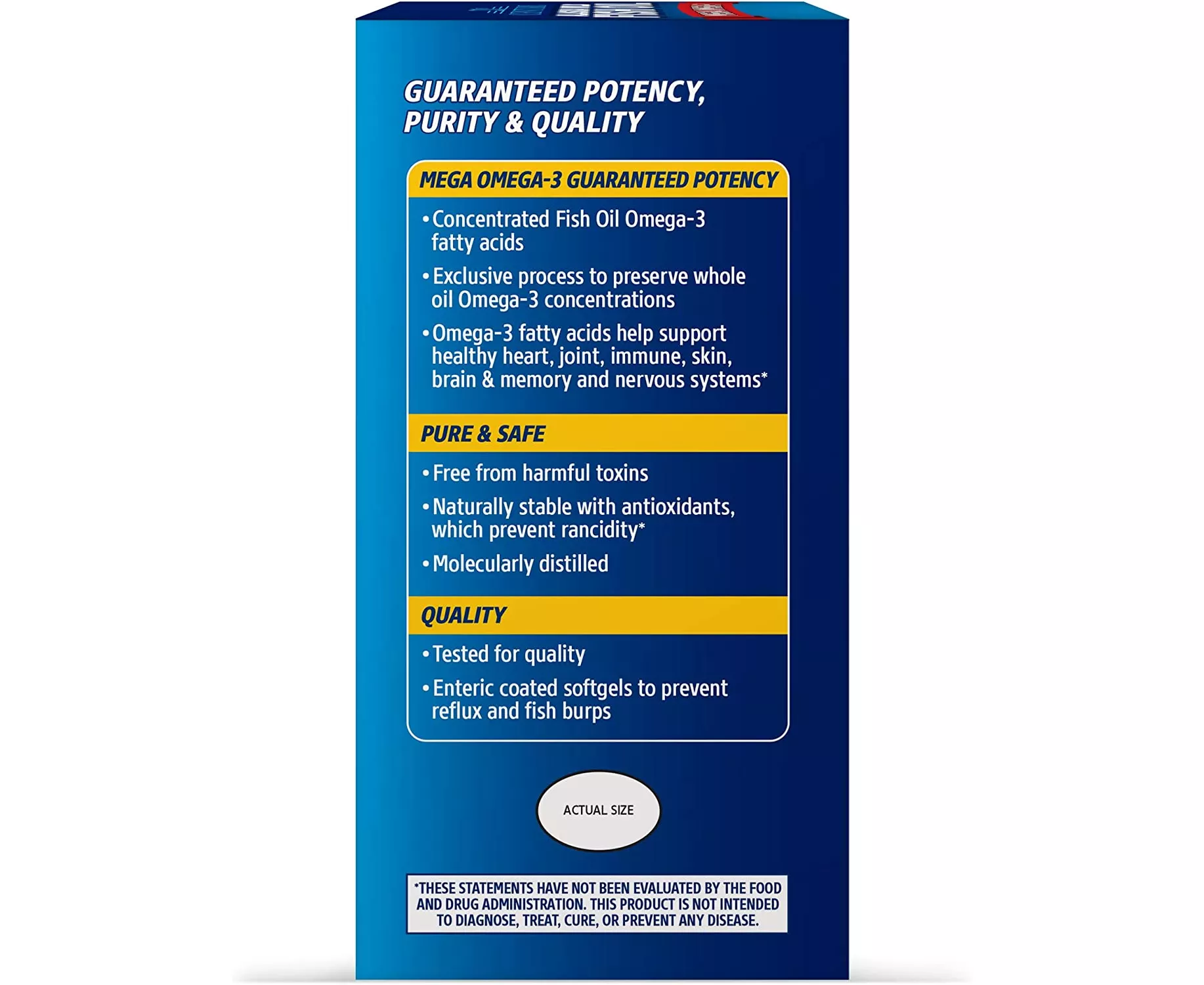Richest concentration of Mega Omega-3 naturally obtainable from fish oil Exclusive process to preserve whole oil. Mega Omega-3 fatty acids helps maintain Healthy Heart, Joint, Immune, Skin, Brain and Memory and Nervous System Supportive but not conclusive research shows that consumption of EPA and DHA omega-3 fatty acids may reduce the risk of coronary heart disease (See supplement facts for fat and cholesterol content)Free from harmful toxins Naturally stable with antioxidants which prevent rancidity Molecularly distilled. From cold water deep sea fish Non-Farm Raised Enteric coated soft gels to prevent reflux and fish burps. Richest Levels of Naturally Occurring EPA & DHA. Helps maintain healthy levels of cholesterol already within normal limits. Free from fishy aftertaste found with other fish oil and EPA/DHA products This product contains soy and fish (herring, anchovy, mackerel, sardine, sprat, and salmon) ingredients. These statements have not been evaluated by the Food and Drug Administration. This product is not intended to diagnose, treat, cure or prevent any disease.
