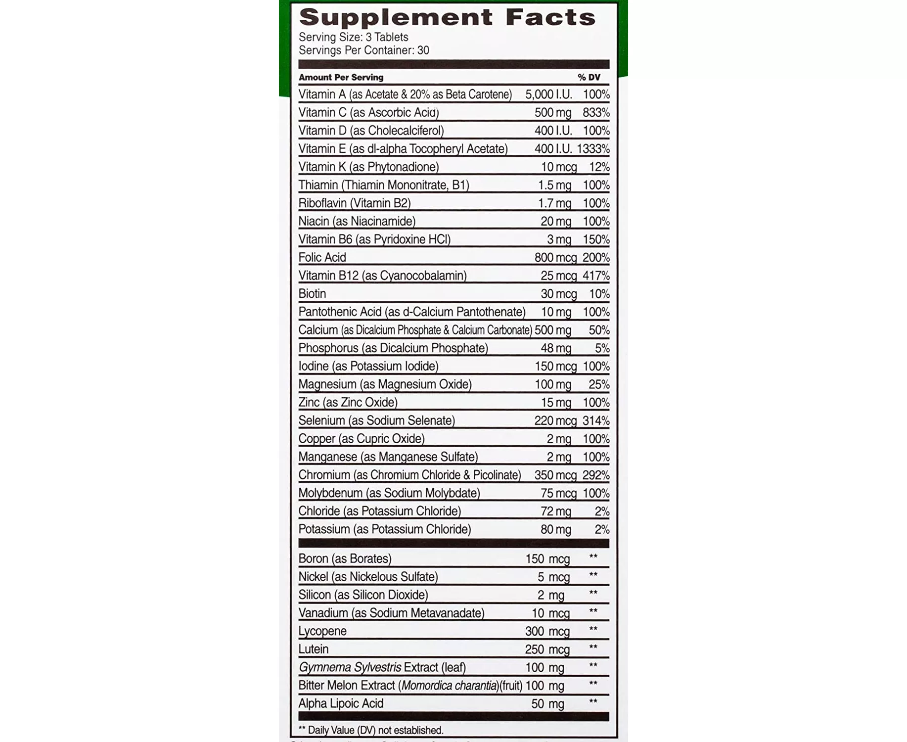 21st Century's Diabetic Support Formula provides a dynamic combination of vitamins and minerals that could be low due to the stress that diabetics can have on a body. It includes the key anti-oxidant nutrients, Vitamin A, Vitamin C, Vitamin E, and Selenium, as well as, Alpha Lipoid Acid which, along with its anti-oxidant benefits, may help maintain healthy glucose metabolism. Folic Acid is added as support for normal heart health and Chromium Pico Linate to aid in the normal metabolism of protein and fat. With added herbal support from Bitter Melon and Gymea Silvestre's, 21st Century's Diabetic Support Formula is specifically designed as nutritional support for people with diabetes.
