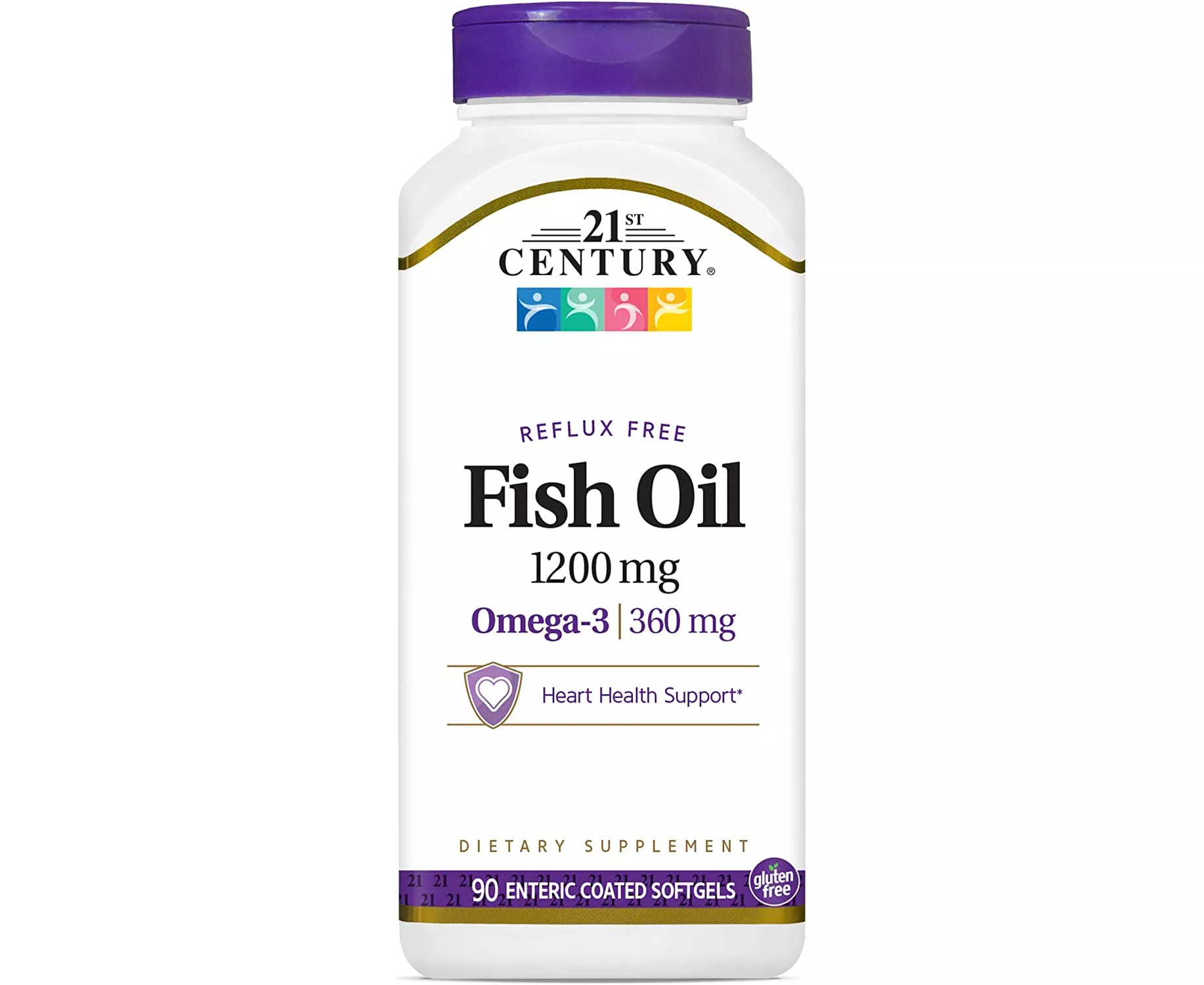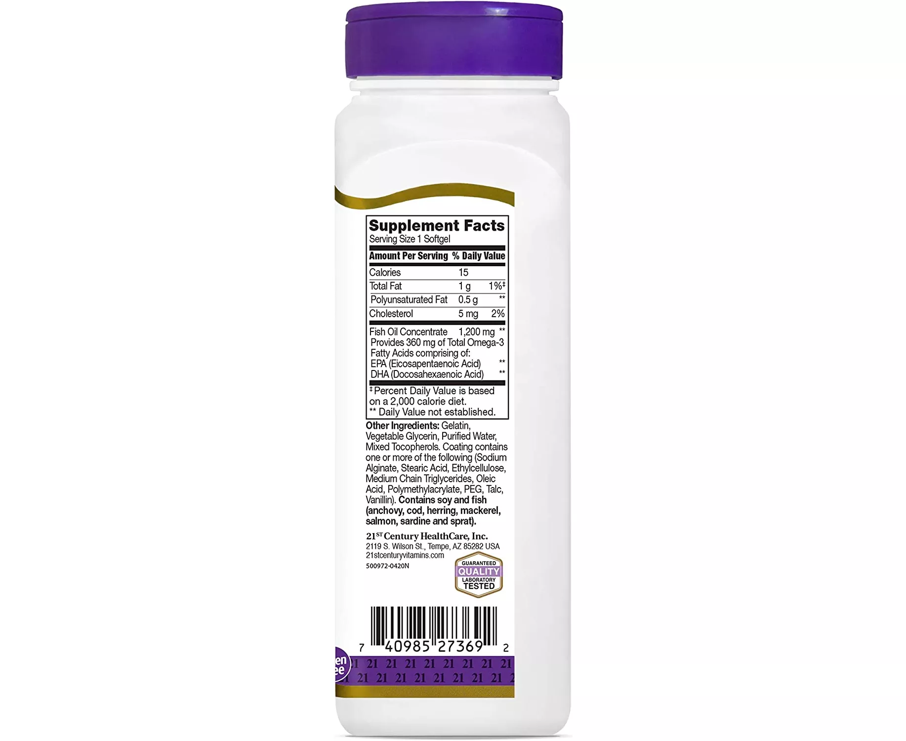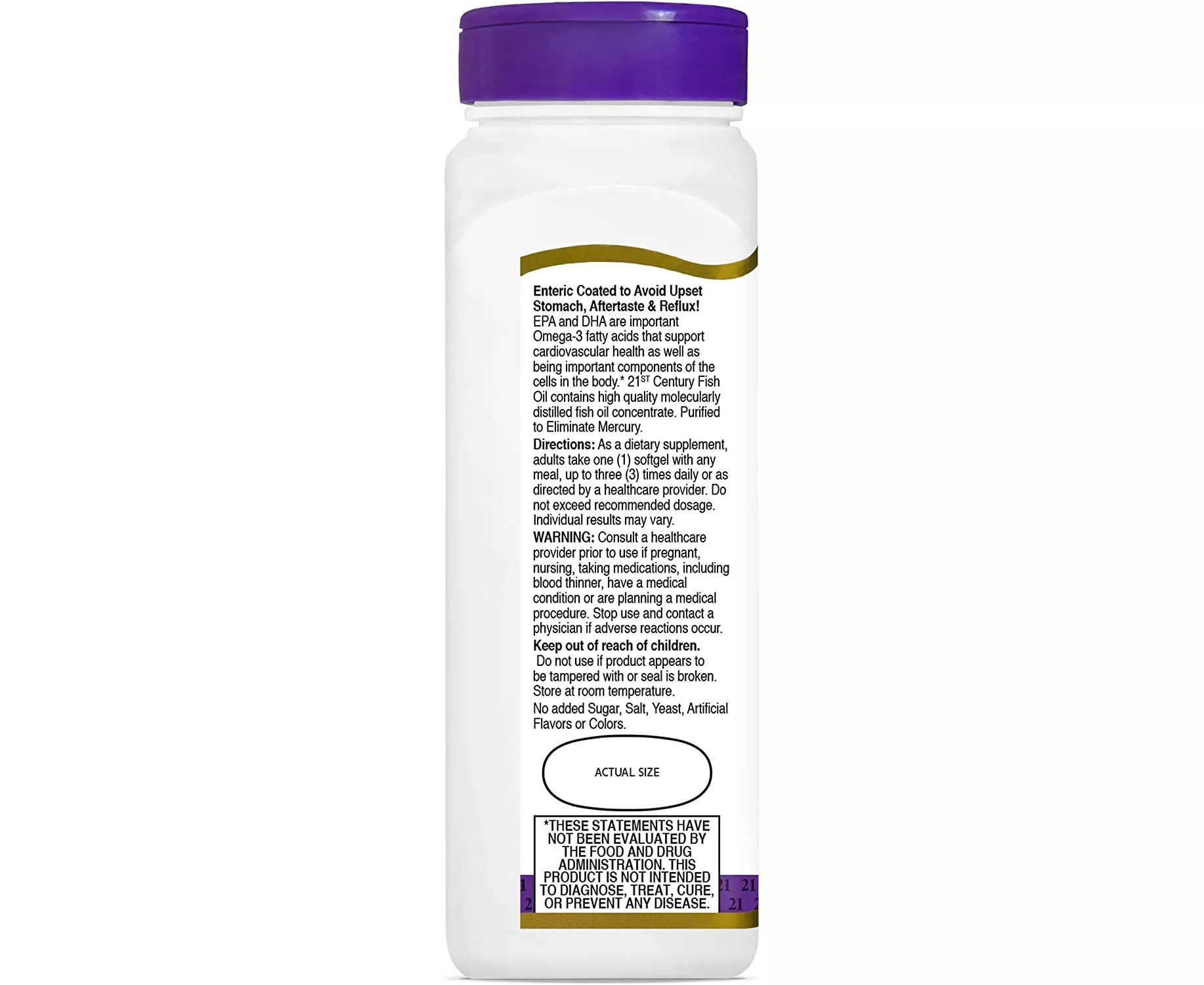 Enteric coated to avoid upset stomach, aftertaste and reflux! Supportive but not conclusive research shows that consumption of EPA and DHA Omega-3 fatty acids may reduce the risk of coronary heart disease. One serving of 21st Century's Fish Oil 1200 mg provides 360 mg of EPA and DHA Omega-3 fatty acids. (See supplement facts image for total fat and saturated fat content.) These Omega-3 fatty acids help maintain cholesterol levels which are within normal range. 21st Century's Fish Oil 1200 mg contains the highest quality molecularly distilled fish oil concentrate. freshness and label potency. No added sugar, yeast, artificial flavors or colors. 21st Century Vitamins and Supplements are manufactured in a cGMP facility under the strictest standards for product quality, including potency and purity. 21st Century prides itself on providing you with a great product at the best value. This statement has not been evaluated by the Food and Drug Administration. This product is not intended to diagnose, treat, cure, or prevent any disease.