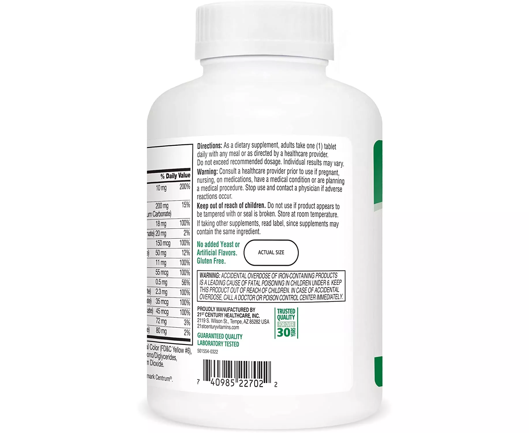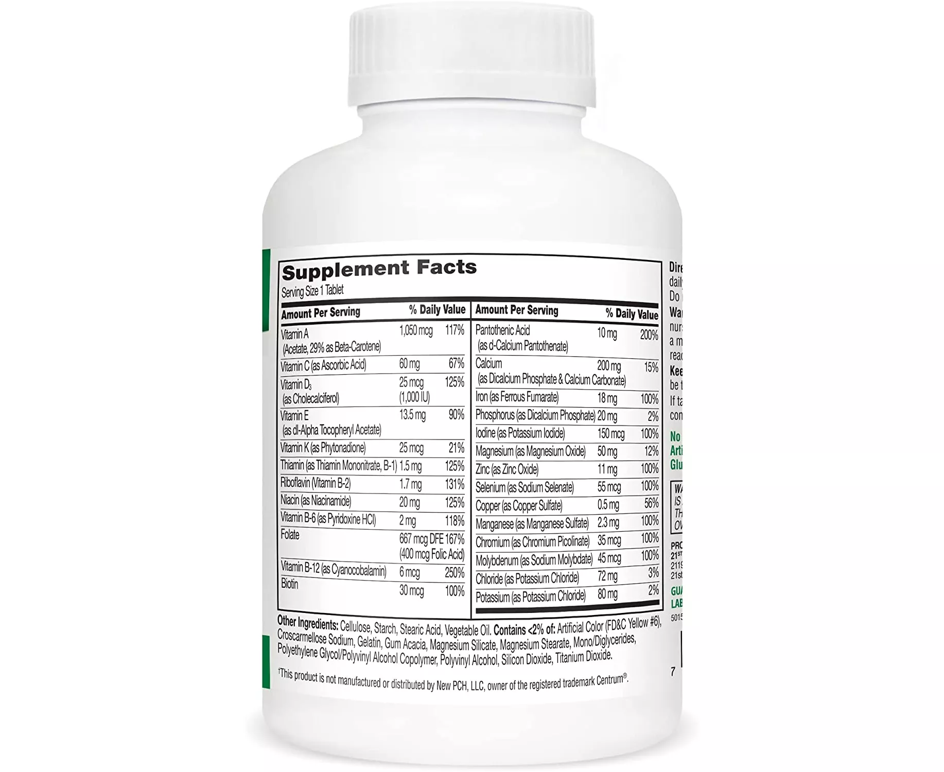 Cellulose, starch, stearic acid, vegetable oil. Contains <2% of: artificial color (fd&c yellow #6), ascorbyl palmitate, bha, bht, croscarmellose sodium, dl-alpha tocopherol, ethylcellulose, gelatin, gum arabic, magnesium silicate, magnesium stearate, maltodextrin, mannitol, mono/diglycerides, peg/pva copolymer, polyvinyl alcohol, silicon dioxide, sodium aluminosilicate, sucrose, titanium dioxide, water.