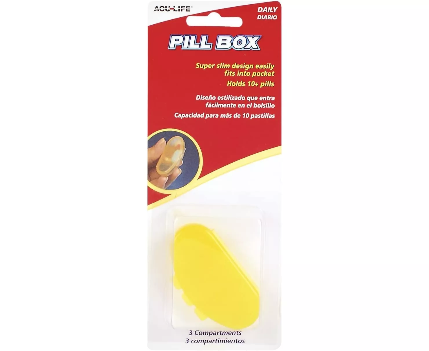 Three compartment kidney-shaped pill box. Acu-Life is a world leader for innovative self-care products. For over 35 years Acu-Life has designed and developed self-care products that positively impact the lives of people throughout the world.