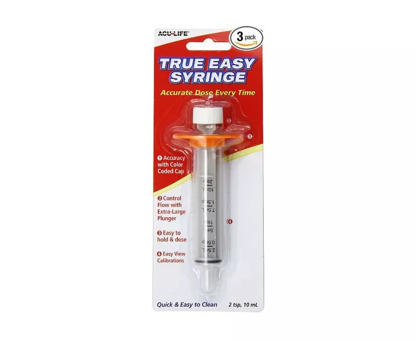 The Acu-Life True Easy Syringe is a liquid medication dosage device designed to help caretakers administer a safe and precise prescribed dose. The patented True Easy Syringe delivers an accurate dose of medication every time. It features a color-coded dial and built-in safety stops to prevent overdosing.