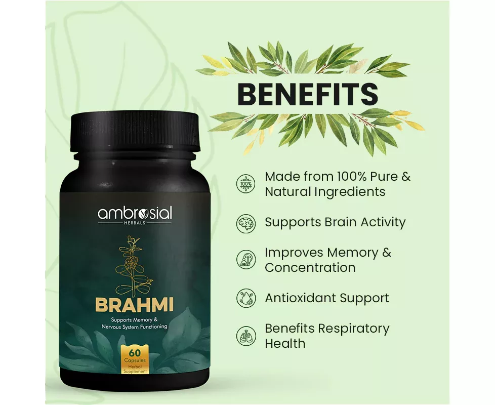 Brahmi is the natural brain booster supplement known for its brain-boosting effects, enhancing memory and focus in the brain. Brahmi Capsules from Ambrosial may help with respiratory health by providing relief from colds and accumulated mucus.