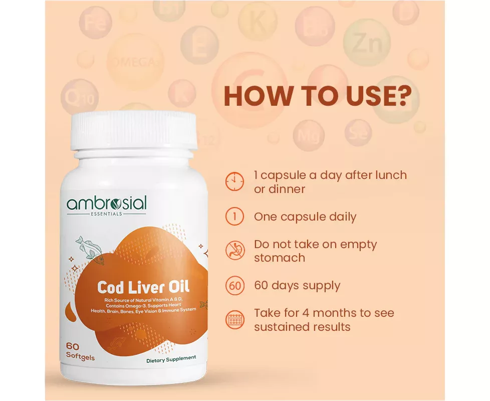 The body needs certain fatty acids in order to operate properly and live a healthy life. Omega-3 fatty acids are one of the most important fatty acids that the body cannot create on its own. They provide a variety of health advantages. Cod Liver Oil SoftGel Capsules from Ambrosial help you meet all of your body's needs.