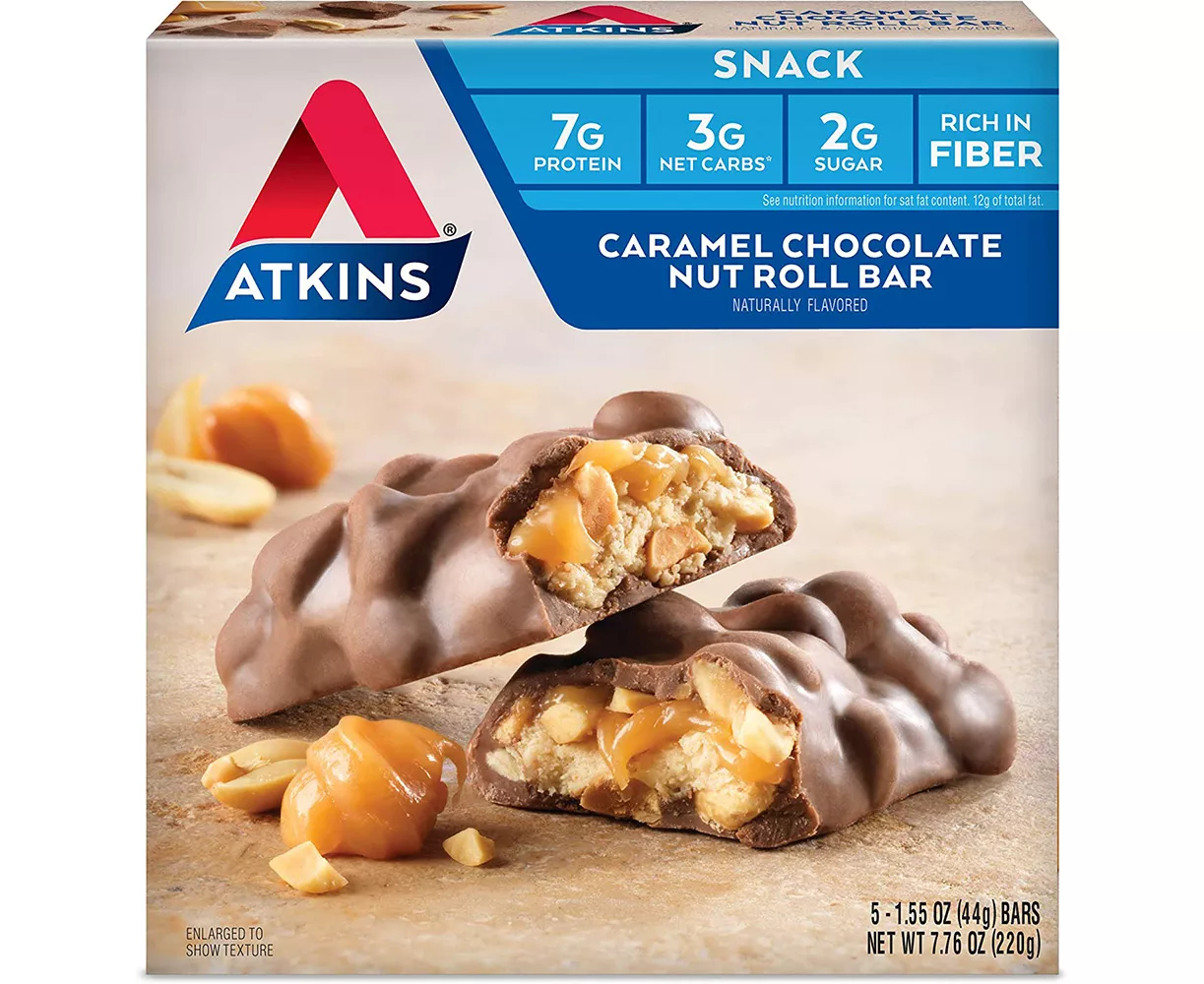 Atkins Caramel Chocolate Nut Roll Snack Bars are a decadent nougat roll with roasted peanuts and caramel covered in chocolate. This snack bar packs all the nutrition your afternoon needs with 7 grams of protein and 7 grams of fiber per serving. Plus, they have 3 grams of net carbs and 2 grams of sugar per bar, making them great for a low-carb and keto-friendly lifestyle.