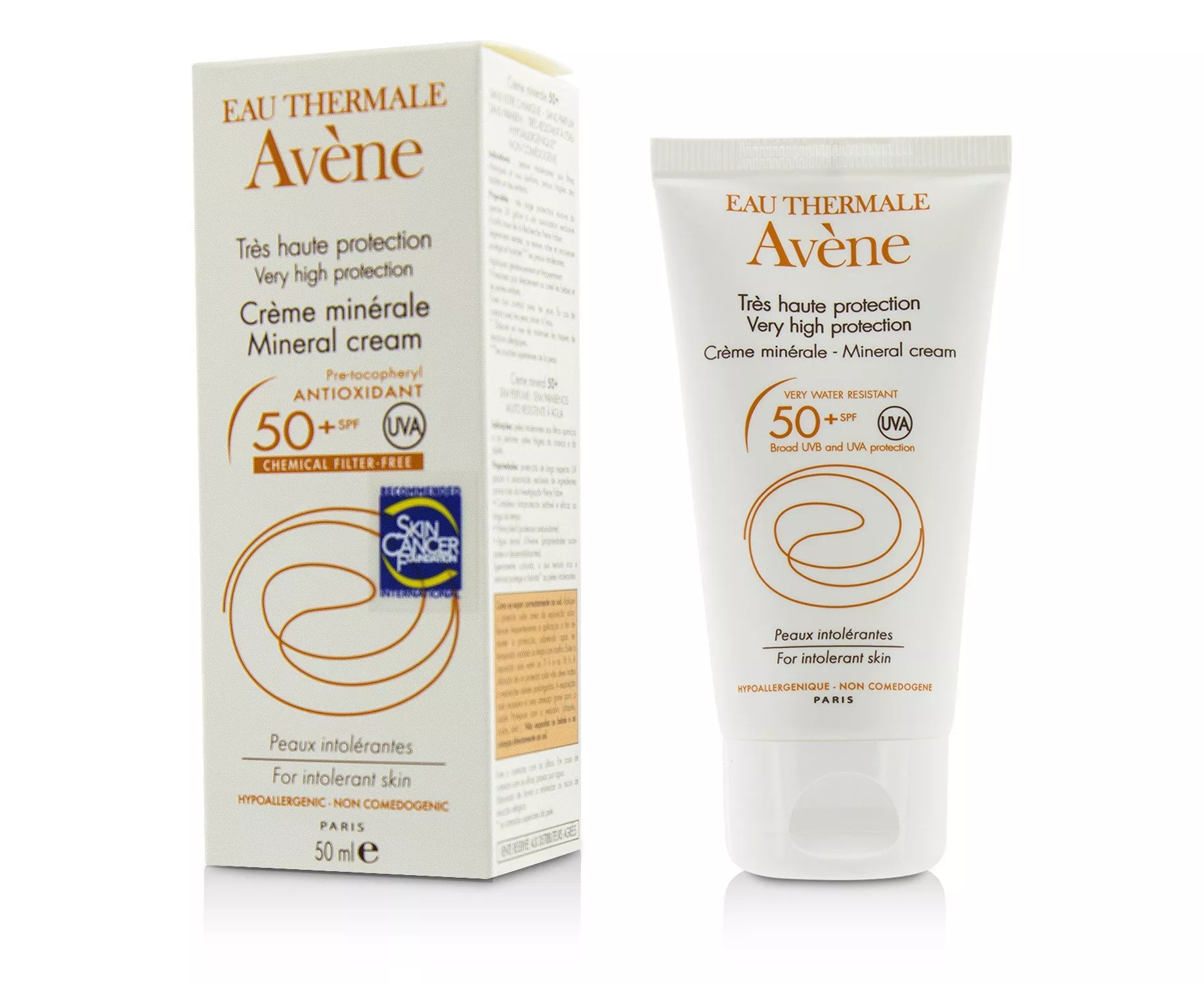 The Mineral Cream SPF 50+ offers very high sun protection for skins intolerant to chemical filters and fragrances, as well as for adult and children's delicate skin. Applied to the face, its rich, creamy formula hydrates and protects the skin.A mineral filter for very broad and stable UVB-UVA protection ensuring optimal skin tolerance.Provitamin E (Pre-tocopherol), a powerful antioxidant, to protect from free radicals.Avène Thermal Spring Water, known for its soothing and softening properties.For the whole family (adults & children).