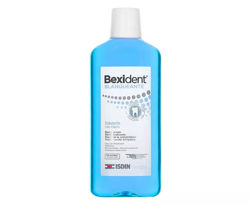 Isdin Bexident Whitening Mouthwash is a triple action whitening mouthwash. Not only does it help whiten the teeth, but also strengthens the enamel by remineralizing it and preventing plaque formation, which is one of the main reasons teeth become yellow. Thanks to its new Pro-Tech Whitening Technology, it can actually be used daily by people with teeth sensitivity, since it does not disrupt teeth. The effective whitening anti-stain action in 7 days of use. The combination of ingredients provides triple anti-plaque action which prevents build-up of dental biofilm, one of the causes of tooth discolouration.