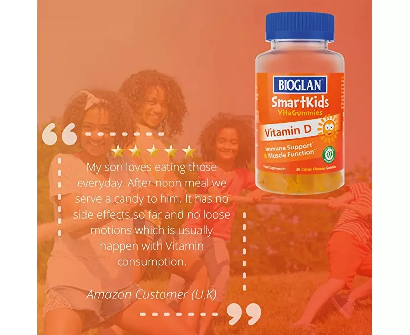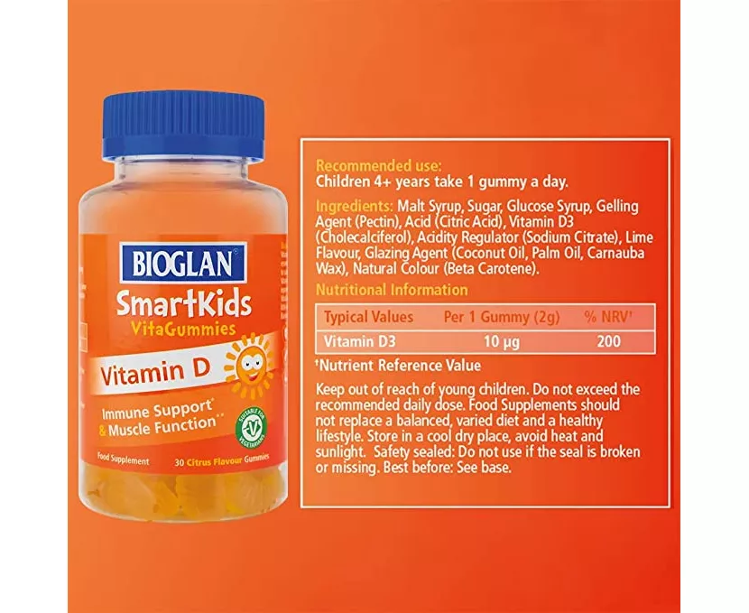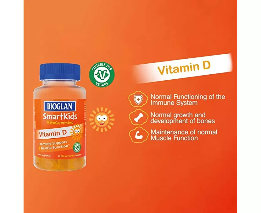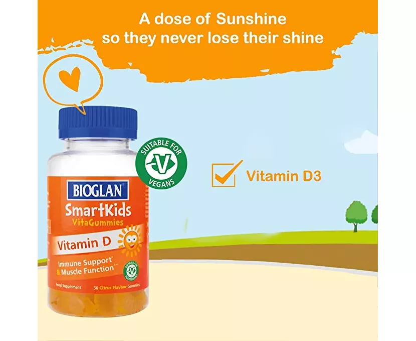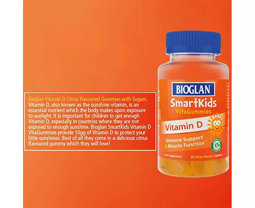 Vitamin d, also known as the sunshine vitamin, is an essential nutrient that the body makes upon exposure to sunlight. It is important for children to get enough vitamin d, especially in countries where they are not exposed to enough sunshine. Bioglan smartkids vitamin d vitagummies provide 10? G of vitamin d to protect your little sunshine. Best of all they come in delicious citrus-flavored gummy which they will love!