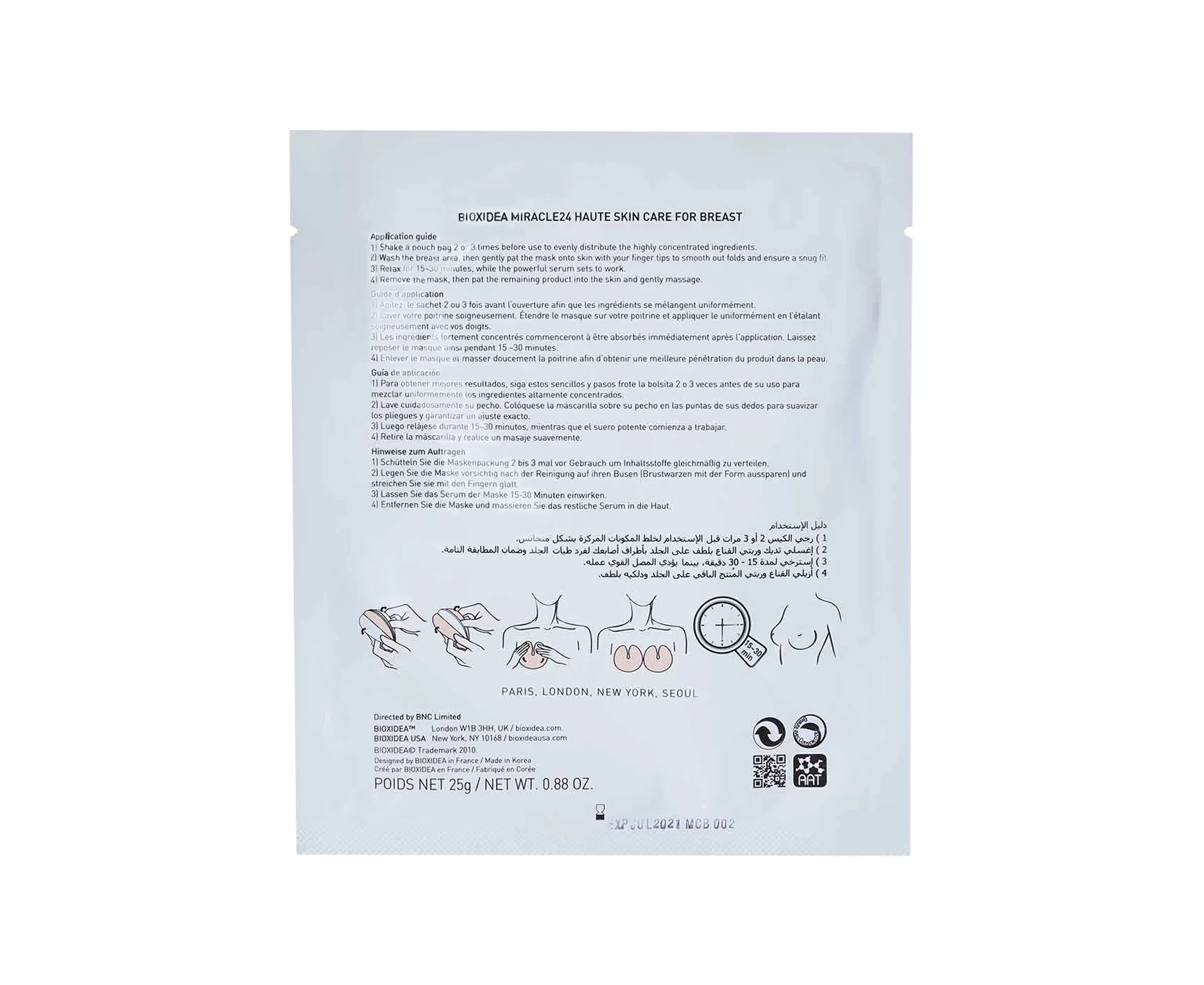 Derived from natural ingredients this Bioxidea Miracle24 Haute Skin Care Breast Mask is an advanced treatment that delivers firming and lifting results to the bust. Hyaluronic acid helps to plump the skin with moisture while hydrolysed collagen helps to increase firmness and elasticity for a smoother, sculpted and lifted look.