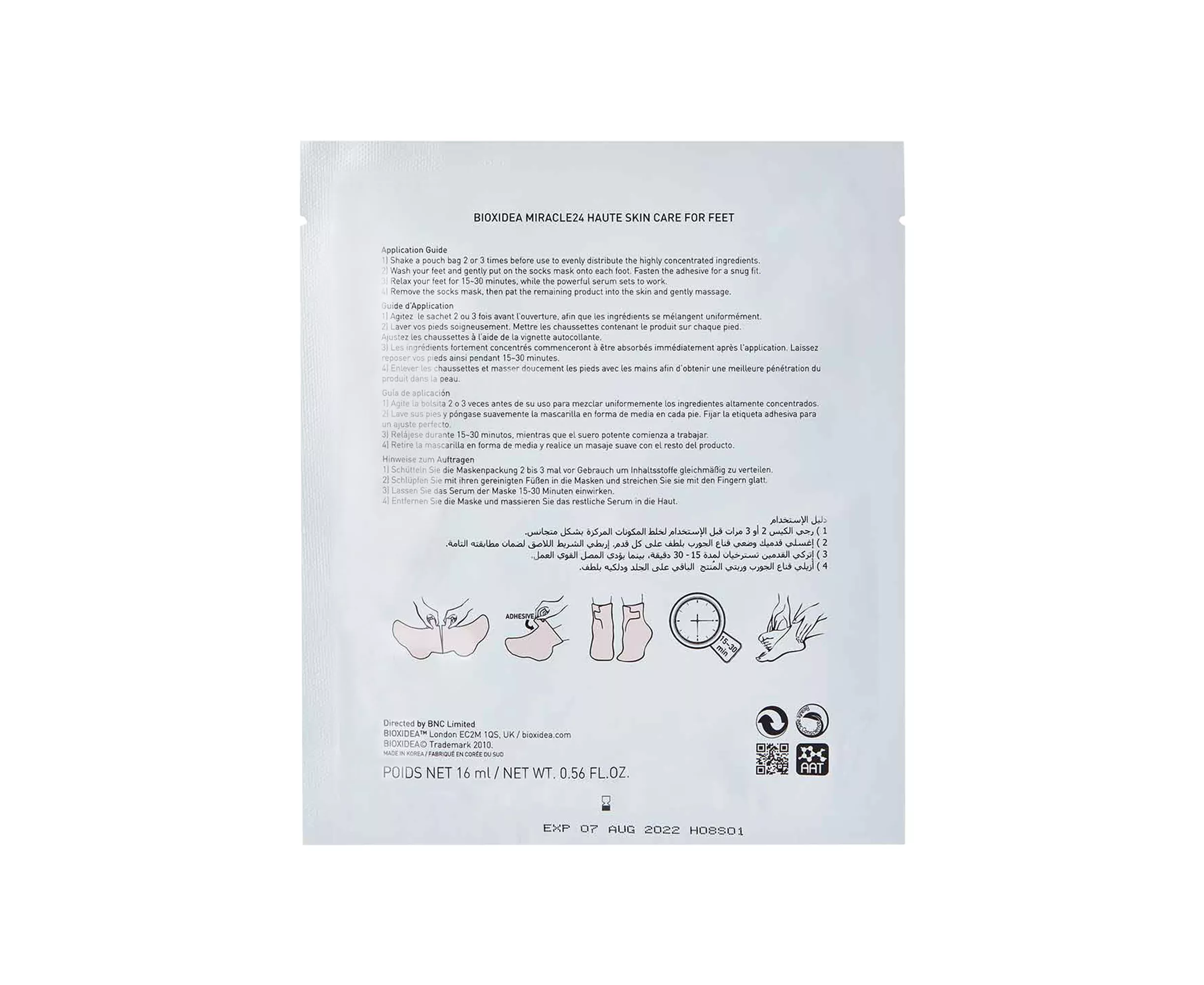 Bioxidea Miracle24 Haute Skin Care Foot Mask is a deluxe foot mask designed to restore soft suppleness. Rich in hydrating omega oils, this targeted treatment provides moisture and comfort for tired, fatigued feet. The nourishing formula leaves skin smooth and silky with an oil-free finish.