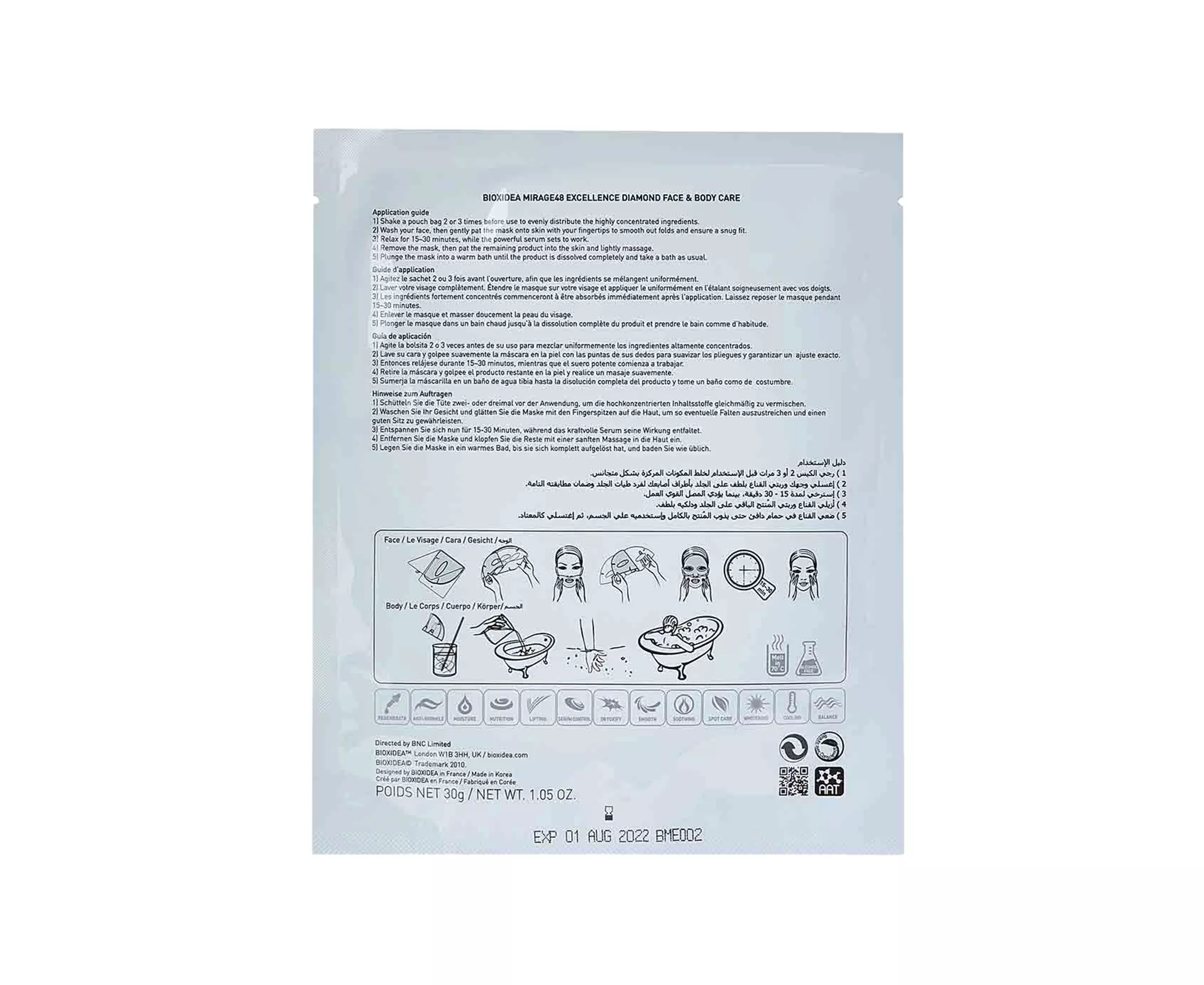 A luxurious spa retreat from the comfort of your own bathroom. Bioxidea's Mirage48 Excellence Diamond Face & Body Mask is a unique beauty delivery system that not only provides effective nourishment to the face but also to the body when dissolved in the bath for overall skin and body brilliance. Infused with peptides, it enhances skin firmness and promotes a glowing, radiant complexion by a unique beautifying profusion of diamond and antioxidant-rich botanicals.