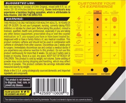 Take one serving (1 level scoop) of C4® Original, mixed with 6 fl. oz of water 20-30 minutes before training. Some individuals may experience a harmless tingling sensation, which is attributed to beta alanine. USE ONLY AS DIRECTED.