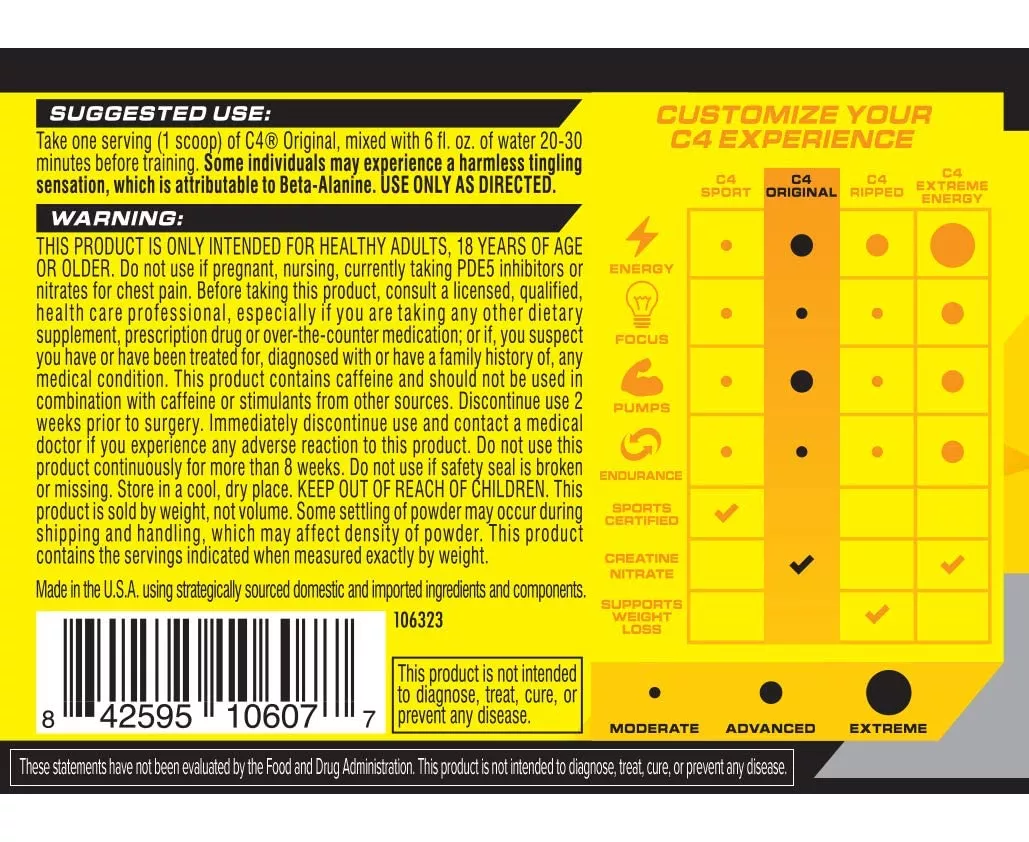 • Cellular C4 Original contains 1.6g of the amino acid CarnoSyn Beta-Alanine, 1g of Creatine Nitrate (NO3-T), 150mg of Caffeine and 1g of Arginine AKG per serving.