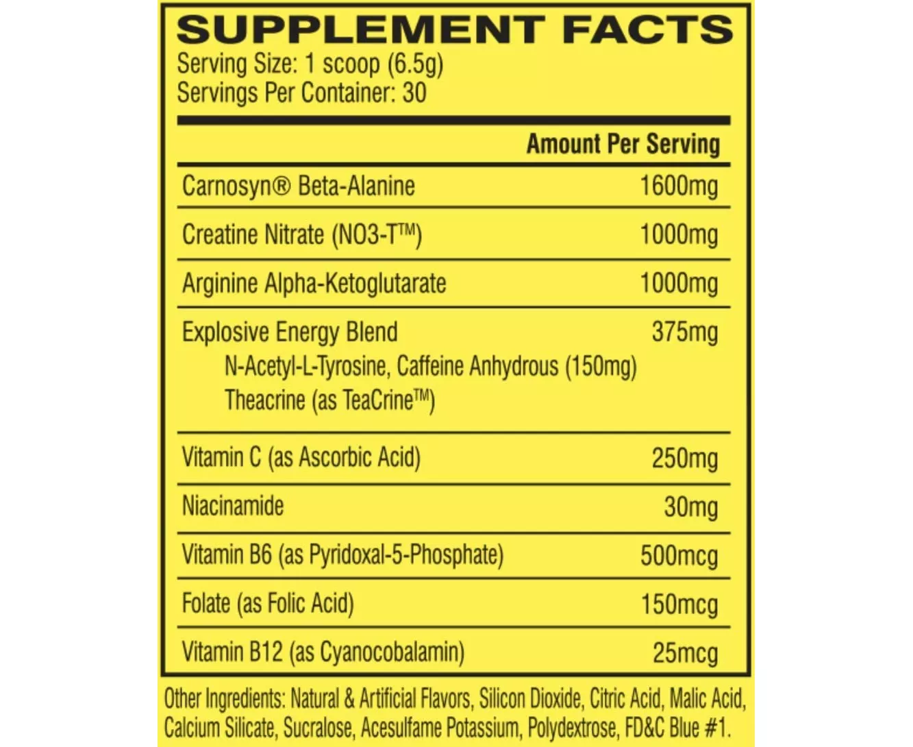 Ingredients: Beta-Alanine, Creatine Nitrate, Arginine Alpha-Ketoglutarate, Natural and Artificial Flavors, Silicon Dioxide, Citric Acid,Ascorbic Acid Vit C,Malic Acid,N-Acetyl Tyrosine,Calcium Silicate,Caffeine Anhydrous,Sucralose,Acesulfame Potassium,Polydextrose -Litesse II,Niacinamide,Theacrine 40%,Color FD&C Blue #1,Theacrine,Pyridoxal 5-Phosphate,Folic Acid USP,Cyanocobalamin