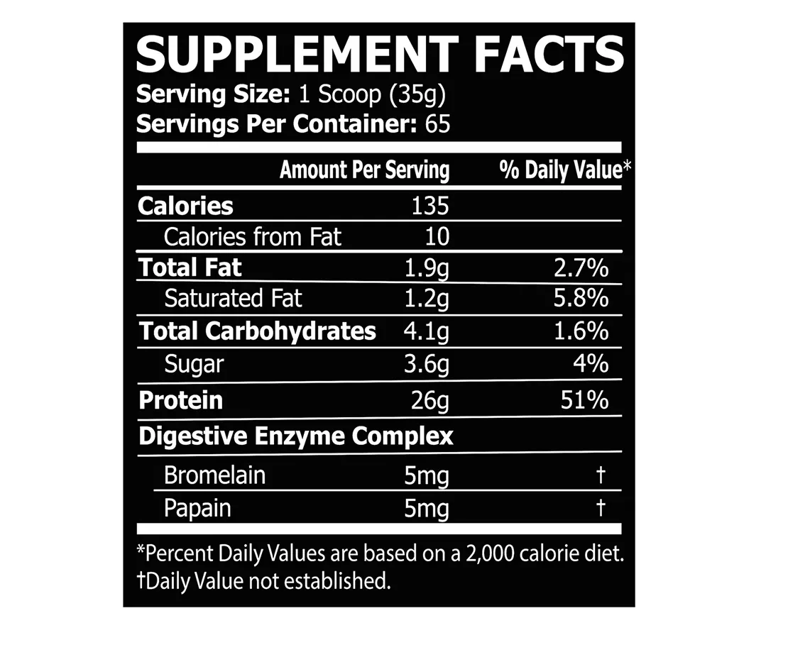 Whey protein blend (whey protein concentrate, whey protein isolate, whey protein hydrolysate), cocoa, sunflower oil, natural and artificial flavor, gum blend(cellulose, xanthan, carrageenan), sucralose, acesulfame k, bromelain extracted from ananas comosus (2500 gdu/g), papain extracted from Carica papaya (6000 usp/g).