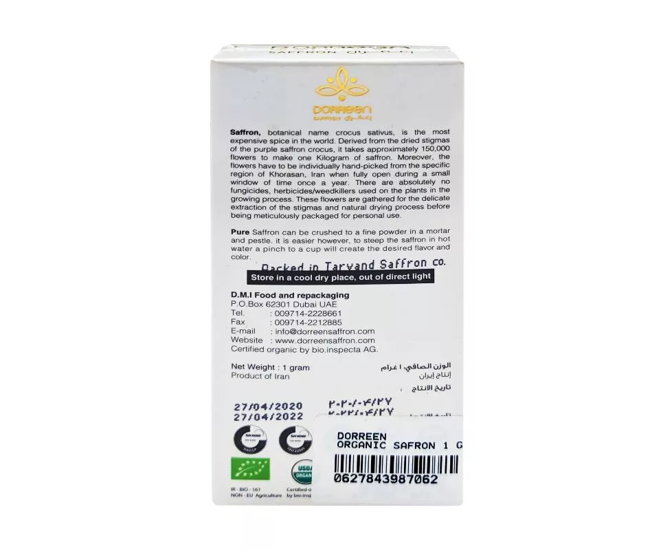 Dorreen is a leading supplier of saffron. Dorreen Saffron has been a market leader in organic and conventional saffron for more than 25 years. The saffron is produced only from the highest quality of saffron flowers - Neign, Pushal and Sarghol. Their organic variety is packed in glass tubes that helps to keep product safe and fresh.