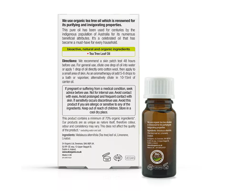 Dr. Organic Tea Tree Pure Oil is a unique aromatic oil with skincare and invigorating properties. Tea tree oil is used for ages due to its multi-benefits and has been adopted as good aromatherapy in almost every household. Enjoy the goodness of pure tea tree oil and indulge in a fragrant and refreshing aroma as you use it.