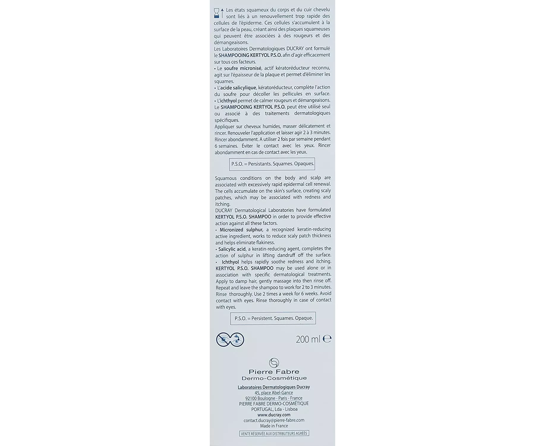 Ducray Kertyol PSO Shampoo has a unique formula that acts on specific elements involved in psoriasis. It is, therefore, the ideal complementary care for psoriatic scalp. With an innovative active ingredient, that has specific anti-inflammatory and soothing actions on elements involved in psoriasis, it helps rapidly improve the appearance of the skin. Due to its ability to slow down the accelerated cell renewal, typical of psoriasis-prone skin, it quickly limits the appearance of new scaly plaques. In addition, its keratolytic action also helps eliminate visible plaques on the scalp. It rapidly calms both itching and redness, thanks to its anti-inflammatory and soothing properties, and is suitable to use in combination with medicinal treatments or as a follow-up, normalizing flaking and also helping prevent recurrences.