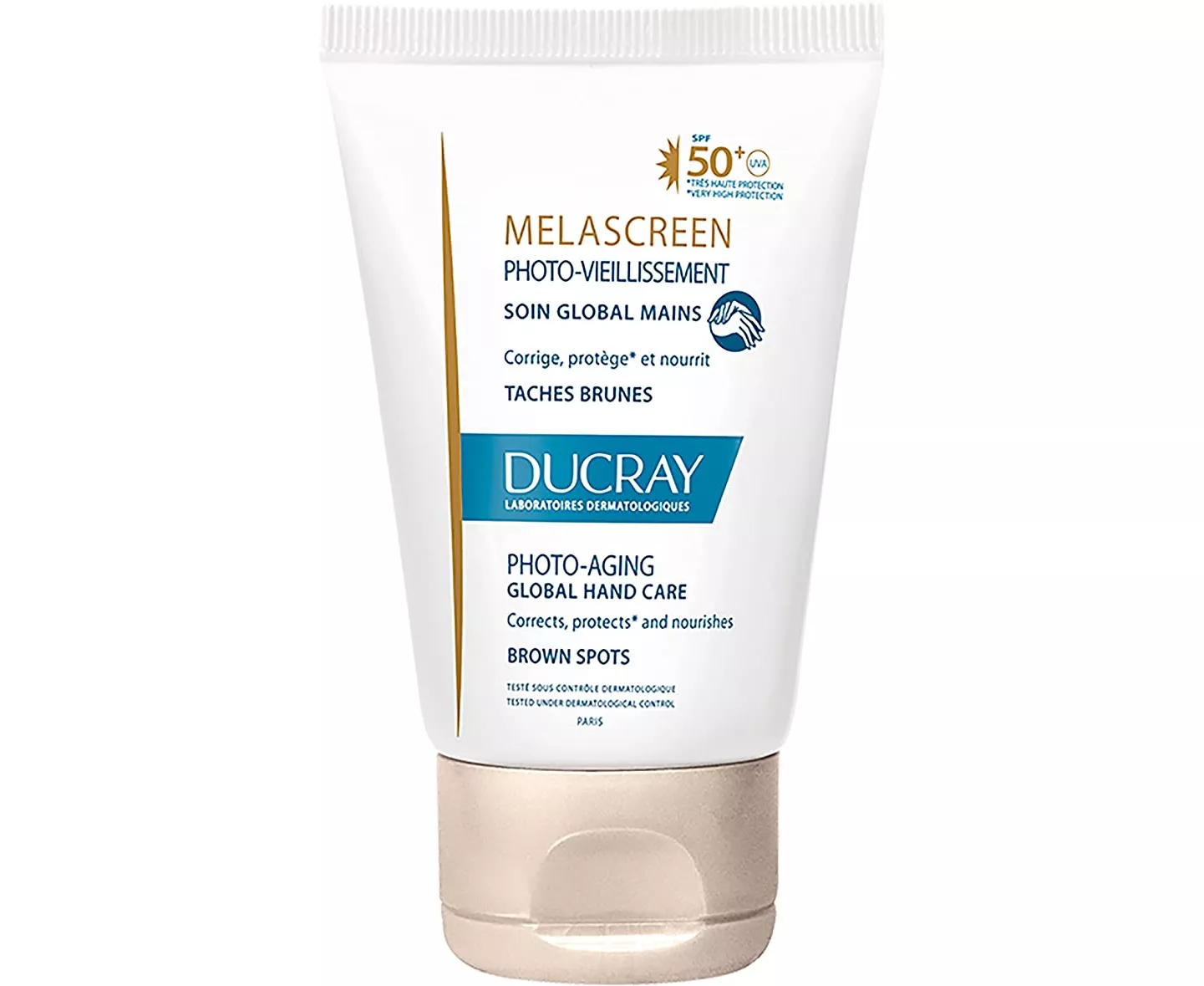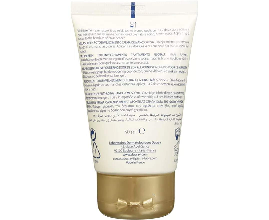 Ducray Melascreen Global Hand Care Photo-Aging SPF50+ is a deeply moisturizing hand cream that delivers superior protection against sun damage. Enrichened with a variety of hydrating agents, this dermatologically-tested formula helps prevent and correct the appearance of brown spots, all the while providing the skin with impressive firmness, flexibility, and softness.