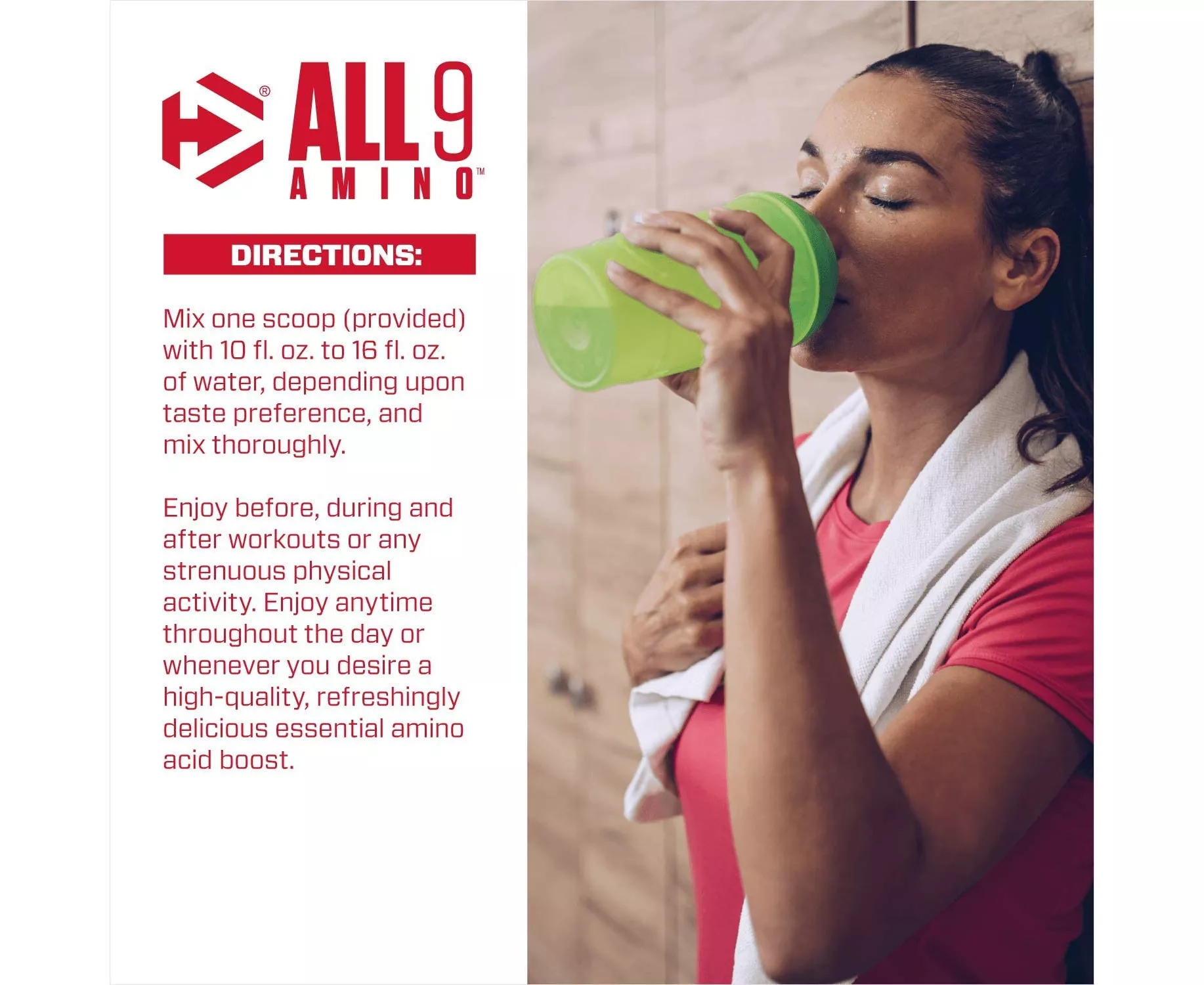 Effectively maintaining and building lean muscle mass requires all nine essential amino acids (EAAs). Ensuring your diet has all nine EAAs can be difficult, so Dymatize has developed ALL9 AMINO our most complete amino acid powder blend for optimal muscle protein synthesis (MPS) and training recovery support. ALL9 AMINO is a serious muscle support product, promoting muscle protein synthesis and training recovery along with a game-changing flavor experience. Smooth, refreshing, delicious-enjoy ALL9 AMINO pre, post, during workouts or drink ALL9 all day.