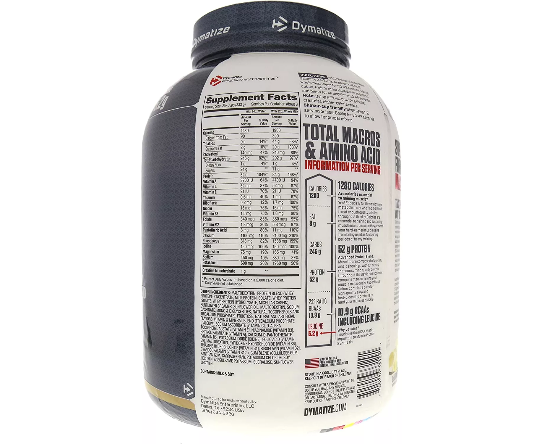 Add 2 1/2 cups of Super Mass Gainer to 24-32 oz of water or 32 oz of whole milk. Blend for 30-45 seconds. Add ice cubes, fruit or other ingredients as desired and blend for an additional 30-45 seconds.