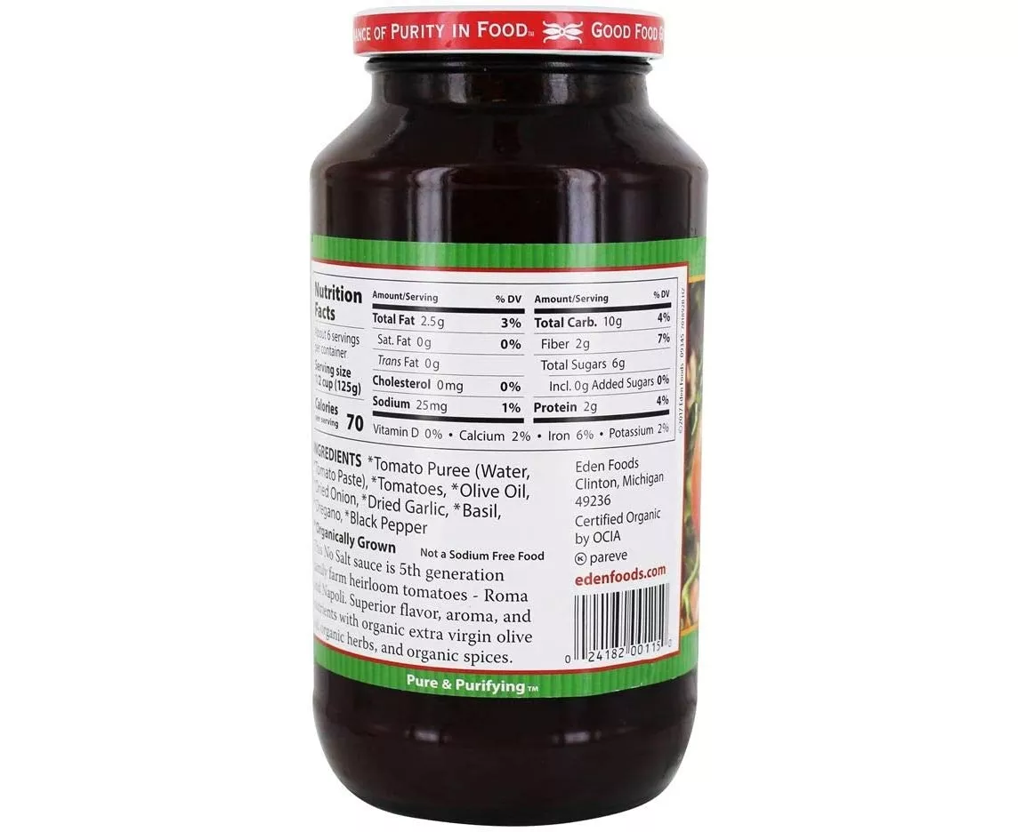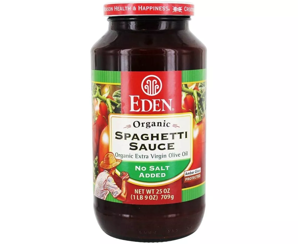 No Salt Spaghetti Sauce has Italian Roma and Napoli tomatoes cooked with a bit of organic EDEN extra virgin olive oil and traditional herbs and spices. No Salt Spaghetti Sauce - Pure and Delicious. Heirloom plum tomatoes make better sauce because they are sweeter, have fewer seeds, deep colour, and firmer flesh. The only tomatoes in the U.S.A, in protective amber glass to prevent light damage of nutrients and flavour components, and avoid bisphenols (BPA & BPS). A good source of phytonutrients.
