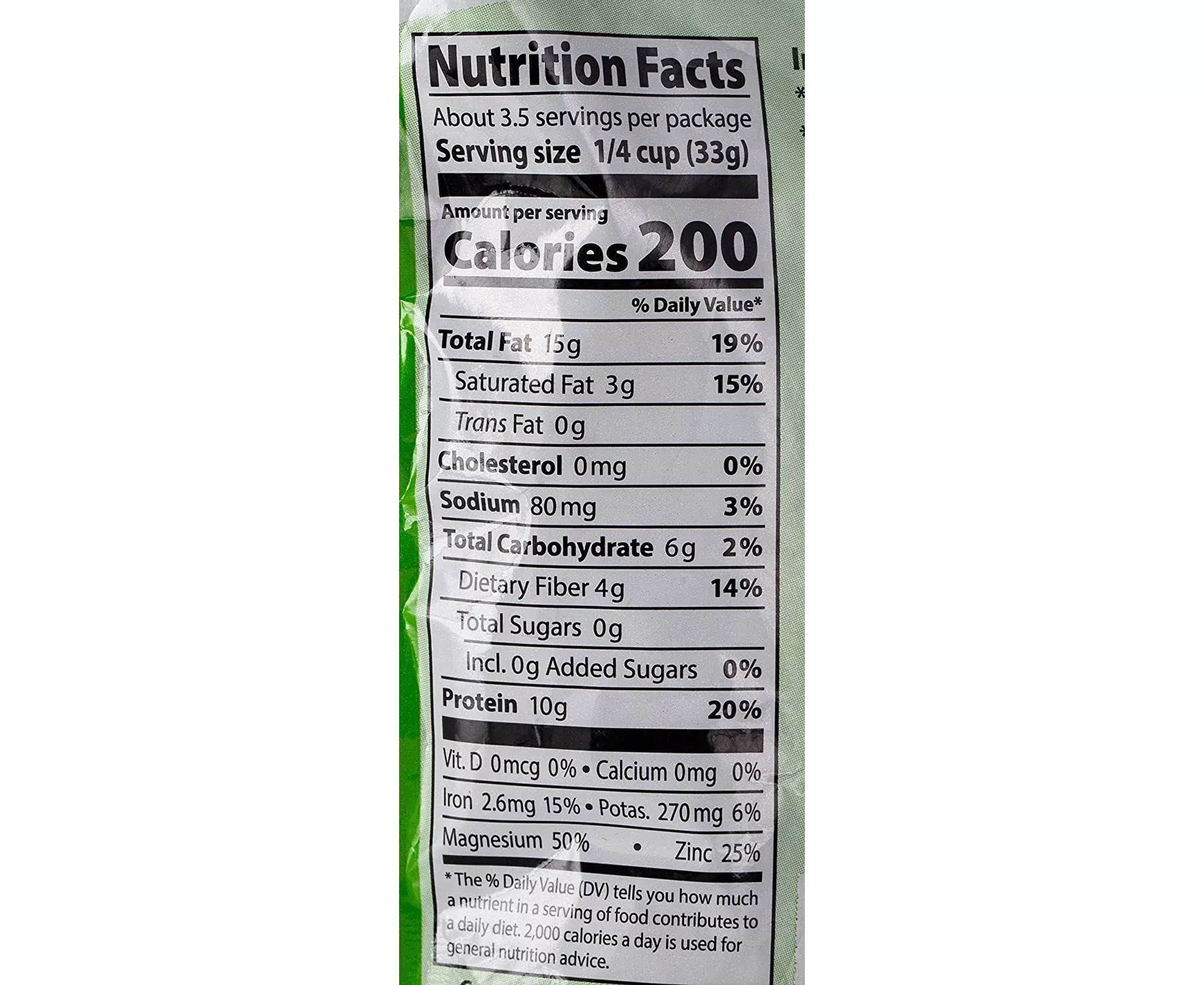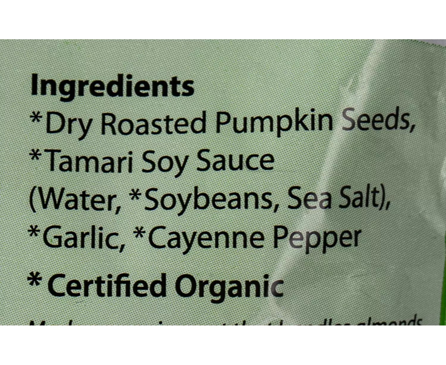 Organic Dry Roasted Pumpkin Seeds, Organic Tamari Soy Sauce (Water, Organic Soybeans, Sea Salt), Organic Garlic, Organic Cayenne Pepper