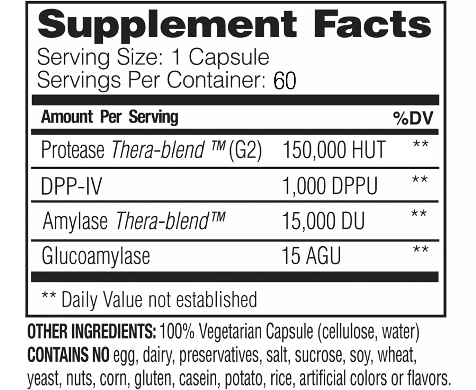 GlutenEase contains Protease Thera-blend (G1) along with DPP-IV activity for enhanced digestion of foods containing gluten and casein. Starch-digesting amylase enzymes assist in the digestion of the carbohydrate portion of grains, such as wheat, which contain gluten.