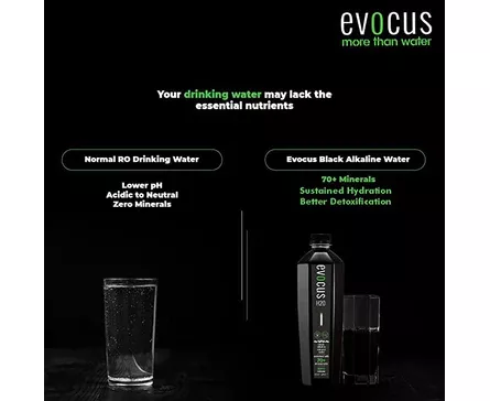 Evocus water is a black alkaline drink infused with essential minerals with a high ph of 8+. Evocus black alkaline drink is a blend of essential minerals and alkaline water. Black alkaline drinks provides sustained hydration - hydrates you faster.