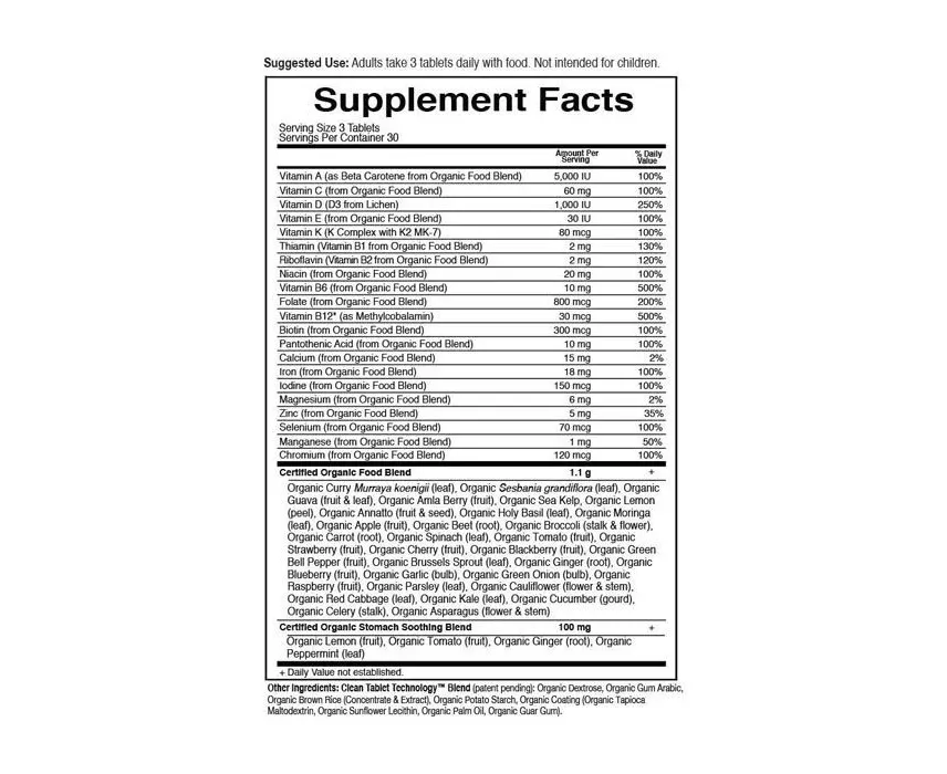 Real Food Formula - Made from over 30 powdered organic fruits, vegetables and herbs.
