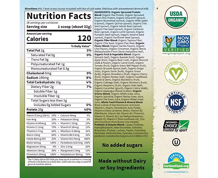 • Organic sprouted brown rice protein, organic sprouted brown rice sweetener, organic amaranth sprout, organic quinoa sprout, organic millet sprout, organic buckwheat sprout, organic garbanzo bean sprout, organic lentil sprout, organic adzuki bean sprout, organic seed flax seed sunflower prout sprout, organic pumpkin seed sprout, organic chia seed sprout, organic sesame seed sprout, organic RAW natural vanilla flavor, RAW natural chai flavor, RAW organic stevia (leaf)