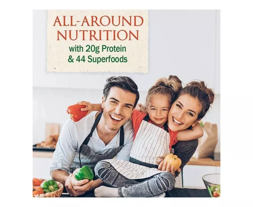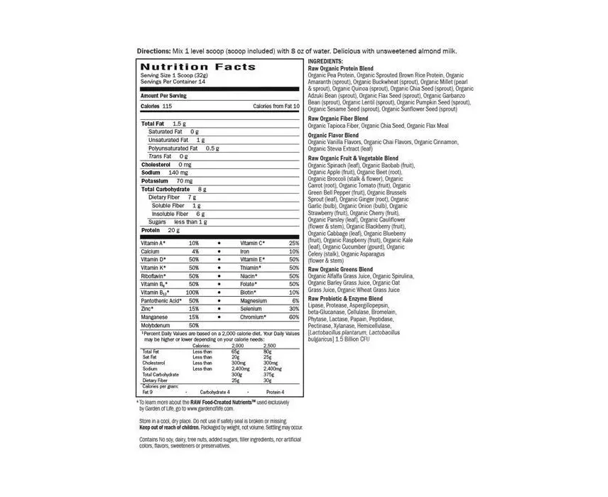 Organic buckwheat (sprouts), organic millet (sprouts and husks), organic quinoa (sprouts), organic chia seeds (sprouts), organic sprouts (sprouts), organic flaxseeds (sprouts), Organic chickpeas (sprouts), organic lentils (sprouts), organic pumpkin seed (sprouts), organic sesame seed (sprouts), organic sunflower seed (sprouts), organic fiber blend: organic tapioca fiber, organic chia seeds, meal Organic Flax, Organic Flavor Blend: Organic Vanilla Flavors, Organic Tea Flavors, Organic Cinnamon, Organic Stevia (Rebaudioside A from Stevia rebaudiana leaves). organic fruit; Botanical blend: Organic spinach (leaves), organic baobab (fruit), organic apple (fruit), organic beet (root), organic broccoli (stems and flowers), organic carrots (roots), organic tomatoes (fruits), organic green peppers. (fruits),