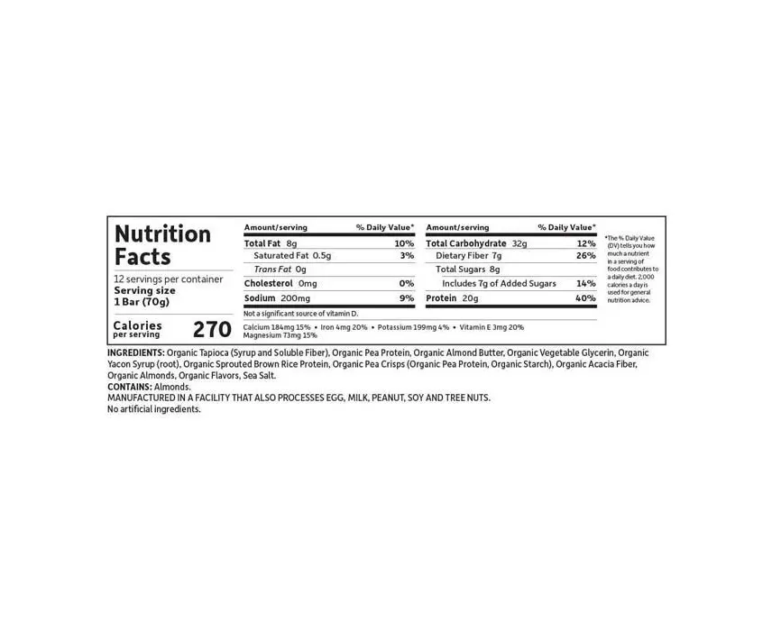 • Organic tapioca syrup (syrup and soluble fiber), organic almonds, organic pea protein, organic vegetable glycerine, organic chocolate coating (organic palm kernel oil, organic erythritol, organic cocoa, organic soluble tapioca fiber, organic stevia (rebaudioside A from the leaf) Stevia rebaudiana, natural licorice extract), organic sprouted brown rice protein, organic pea crackers (organic pea protein, organic pea starch), organic acacia fiber, organic natural flavors, organic guar gum, sea salt, organic stevia (rebaudioside A from the leaves of Stevia rebaudiana).