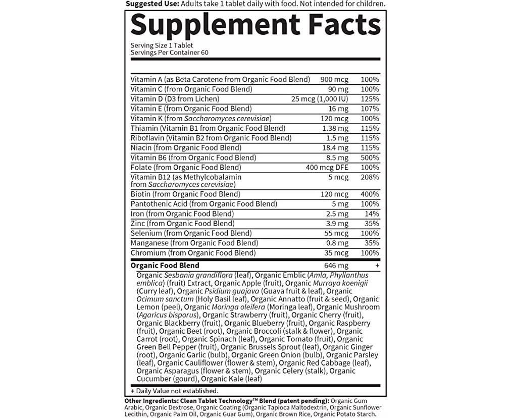 Clean Tablet Technology Blend (Patent Pending): Organic Dextrose, Organic Gum Arabic, Organic Brown Rice (Extract & Concentrate), Organic Potato Starch, Organic Coating (Organic Tapioca Maltodextrin, Organic Sunflower Lecithin, Oil Organic palm, organic guar gum).