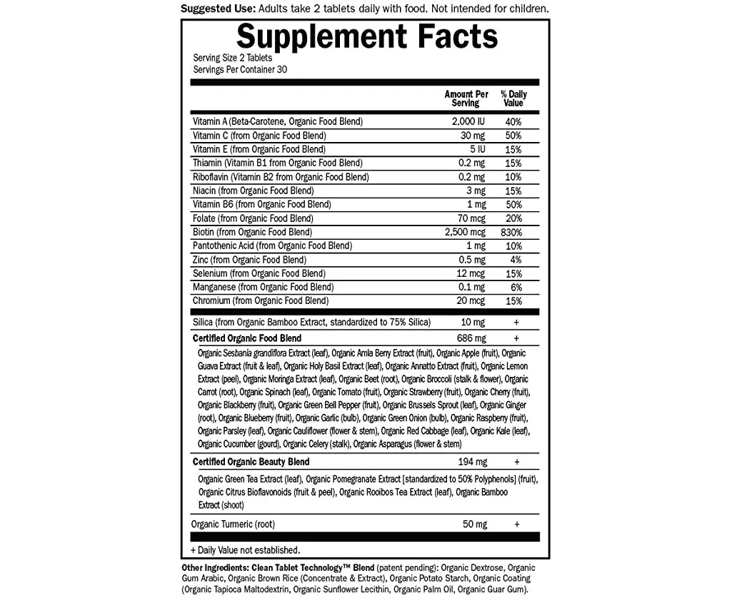 Organic Food Blend: Organic Sesbania grandiflora (leaf), Organic Amla Berry (fruit), Organic Apple (fruit), Organic Guava (fruit & leaf), Organic Annatto (fruit & seed), Organic Holy Basil (leaf), Organic Lemon (fruit & peel), Organic Moringa (leaf), Organic Beet (root), Organic Broccoli (stalk & flower), Organic Carrot (root), Organic Spinach (leaf), Organic Tomato (fruit), Organic Strawberry (fruit), Organic Cherry (fruit), Organic Blackberry (fruit), Organic Green Bell Pepper (fruit), Organic Brussels Sprout (leaf), Organic Ginger (root), Organic Blueberry (fruit), Organic Garlic (bulb), Organic Green Onion (bulb), Organic Raspberry (fruit), Organic Parsley (leaf), Organic Cauliflower (flower & stem), Organic Red Cabbage (leaf), Organic Kale (leaf), Organic Cucumber (gourd), Organic Celery (stalk), Organic Asparagus (flower & stem); Organic Beauty Blend: Organic Green Tea Extract (leaf), Organic Pomegranate Extract [Standardized to 50% Polyphenols] (fruit), Organic Citrus Bioflavonoids (fruit & peel), Organic Rooibos Extract (leaf), Organic Bamboo Extract (shoot) Organic Turmeric (root); Silica from Organic Bamboo Extract (standardized to 75% Silica). Other Ingredients: Clean Tablet Technology™ Blend (patent pending): Organic Gum Arabic, Organic Dextrose, Organic Coating (Organic Sunflower Lecithin, Organic Tapioca Maltodextrin, Organic Palm Oil, Organic Guar Gum), Organic Brown Rice. Made without dairy or soy ingredients, peanut, tree nuts or shellfish. Manufactured in a facility that also processes soy, dairy, peanut, tree nuts and shellfish. No artificial colors or preservatives.