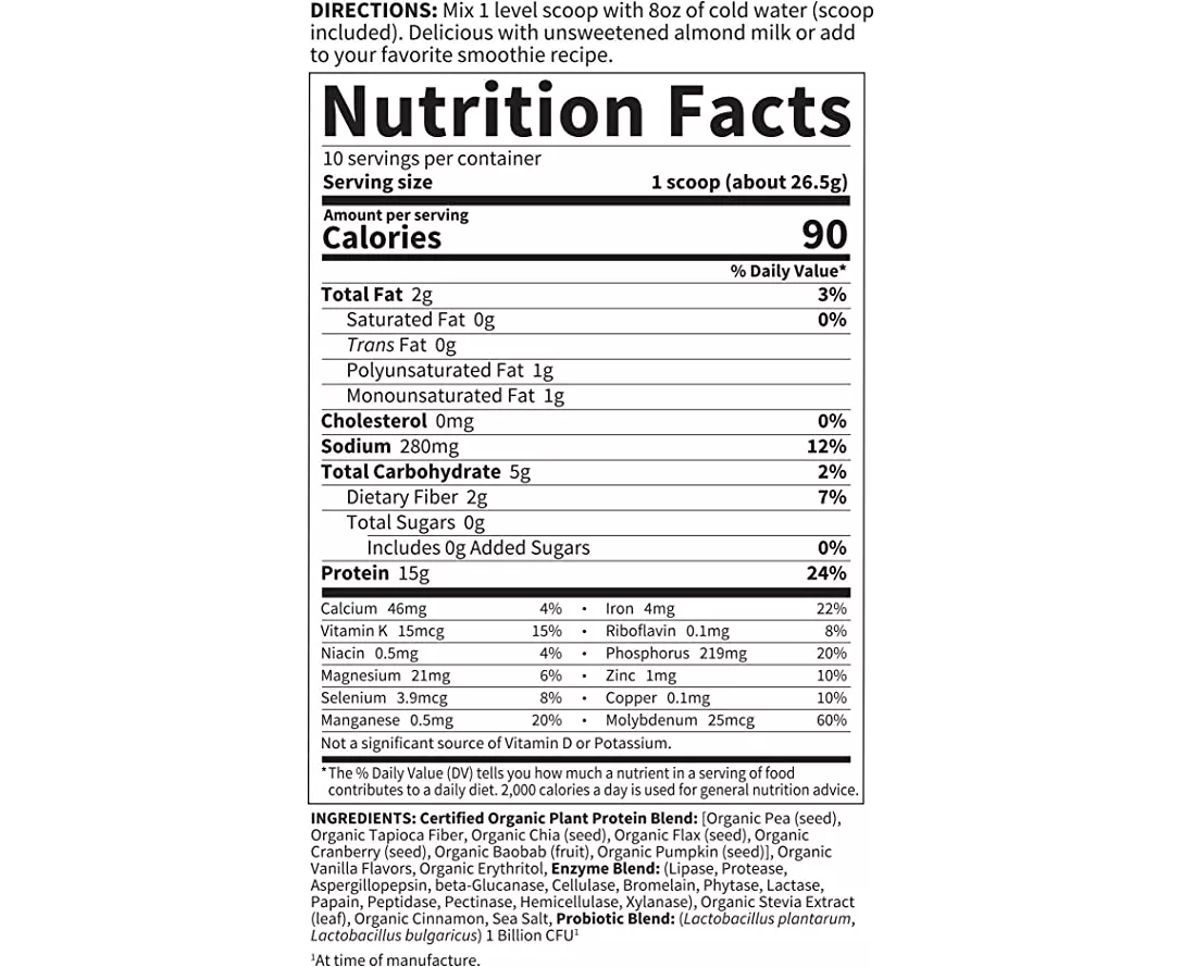 Certified Organic Plant Protein Blend: [Organic Pea (seed), Organic Tapioca Fiber, Organic Chia (seed), Organic Flax (seed), Organic Cranberry (seed), Organic Baobab (fruit), Organic Pumpkin (seed)], Organic Vanilla Flavors, Organic Erythritol; Enzyme Blend: (Lipase, Protease, Aspergillopepsin, beta-Glucans, Cellulase, Bromelain, Phytase, Lactase, Papain, Peptidase, Pectinase, Hemicellulase, Xylanase), Organic Stevia Extract (leaf), Organic Cinnamon, Sea Salt; Probiotic Blend: (Lactobacillus plantarum, Lactobacillus bulgaricus) 1 Billion CFU. Made without dairy or soy ingredients, tree nuts, added sugars, filler ingredients, nor artificial colors, flavors, sweeteners or preservatives. Manufactured in a facility that also processes egg, milk, soy and tree nuts. May contain traces of soy due to agricultural practices.