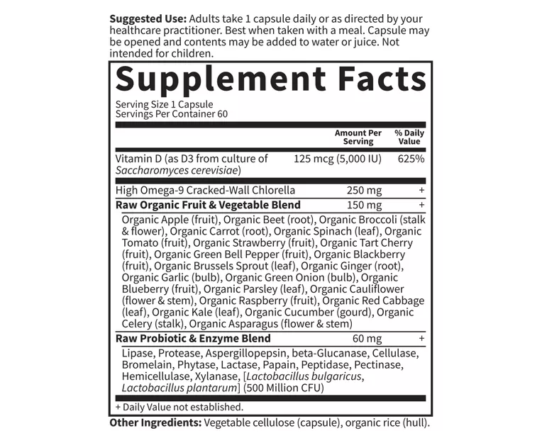 vitamin code raw d3—raw whole food vitamin d3 delivered in a whole food lipid base of cracked-wall chlorella to promote absorption† and blended in a base of 23 fruits and vegetables with live probiotics and enzymes.