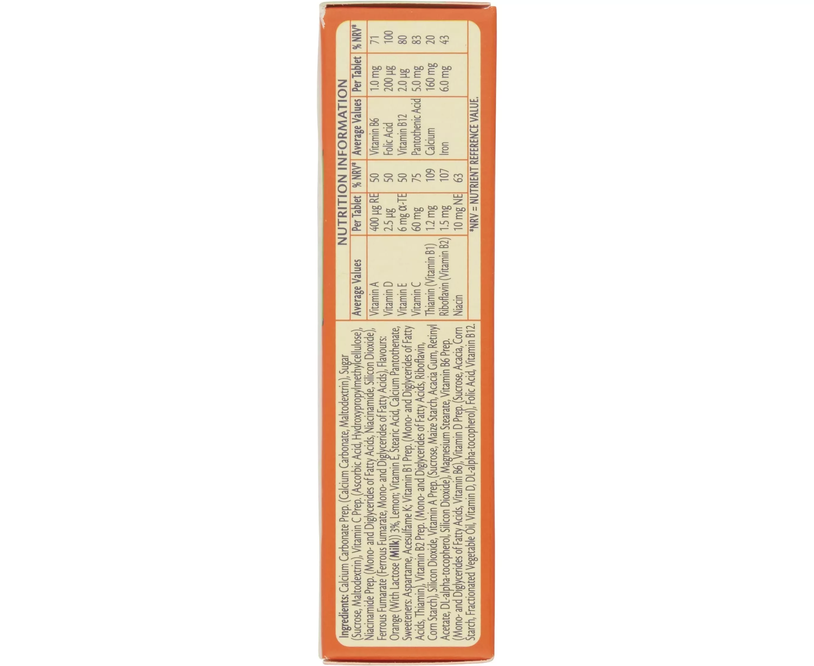 Calcium carbonate prep. (calcium carbonate, maltodextrin), sugar (sucrose, maltodextrin), vitamin c prep. (ascorbic acid, hydroxypropylmethylcellulose), niacinamide prep. (mono- and diglycerides fatty acids, niacinamide, silicon dioxide), ferrous fumarate (ferrous fumarate, mono- and diglycerides fatty acids), flavours: orange (with lactose (milk)) 3%, lemon; vitamin e, stearic acid, calcium pantothenate, sweeteners: aspartame, acesulfame k, vitamin b1 prep. (mono- and diglycerides fatty acids, vitamin b1), vitamin b2 prep. (mono- and diglycerides of fatty acids, riboflavin, corn starch), silicon dioxide, vitamin a prep. (sucrose, maize starch, acacia gum, retinyl acetate, dl-alpha-tocopherol, silicon dioxide), magnesium stearate, vitamin b6 prep. (mono- and diglycerides of fatty acids, vitamin b6), vitamin d prep. (suctose, acacia, corn starch, fractionated vegetable oil, vitamin d, dl- alpha-tocopherol), folic acid, vitamin b12.