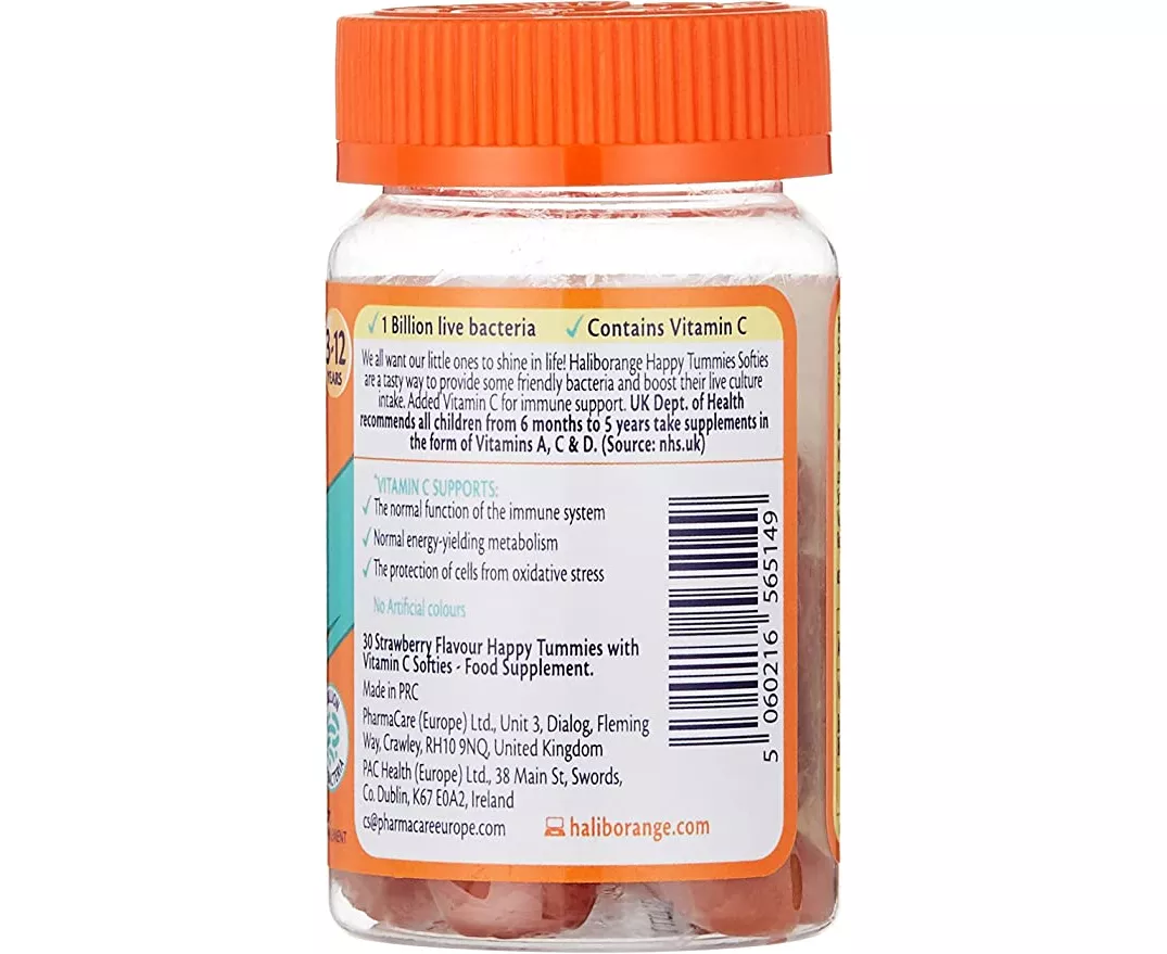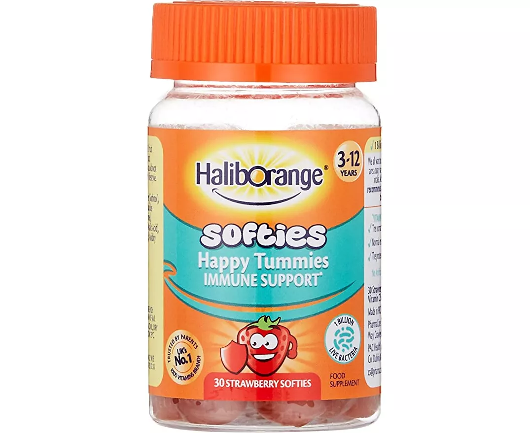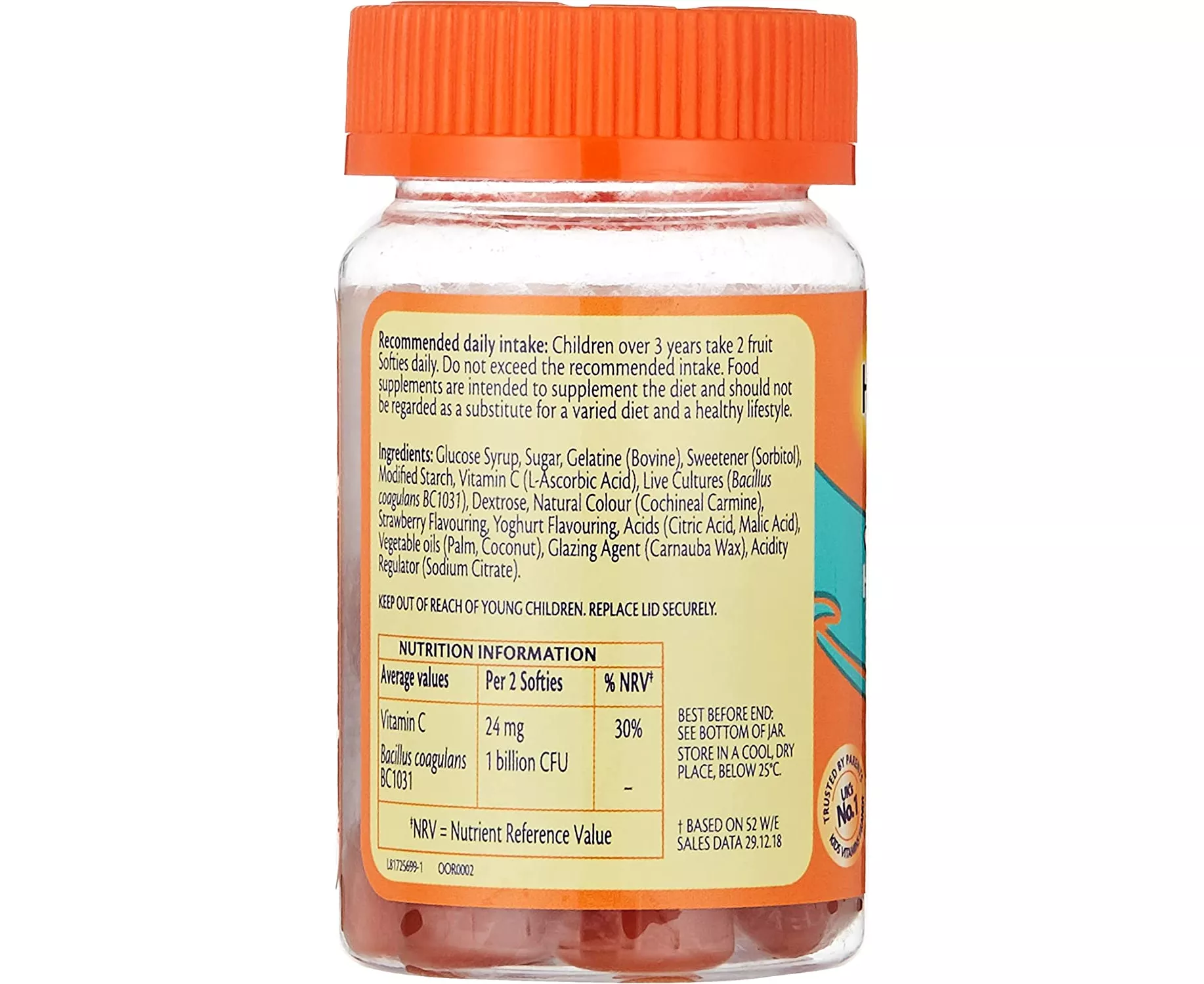 Haliborange kids strawberry flavored softies with 1 billion live bacteria for a healthy gut and immune support.