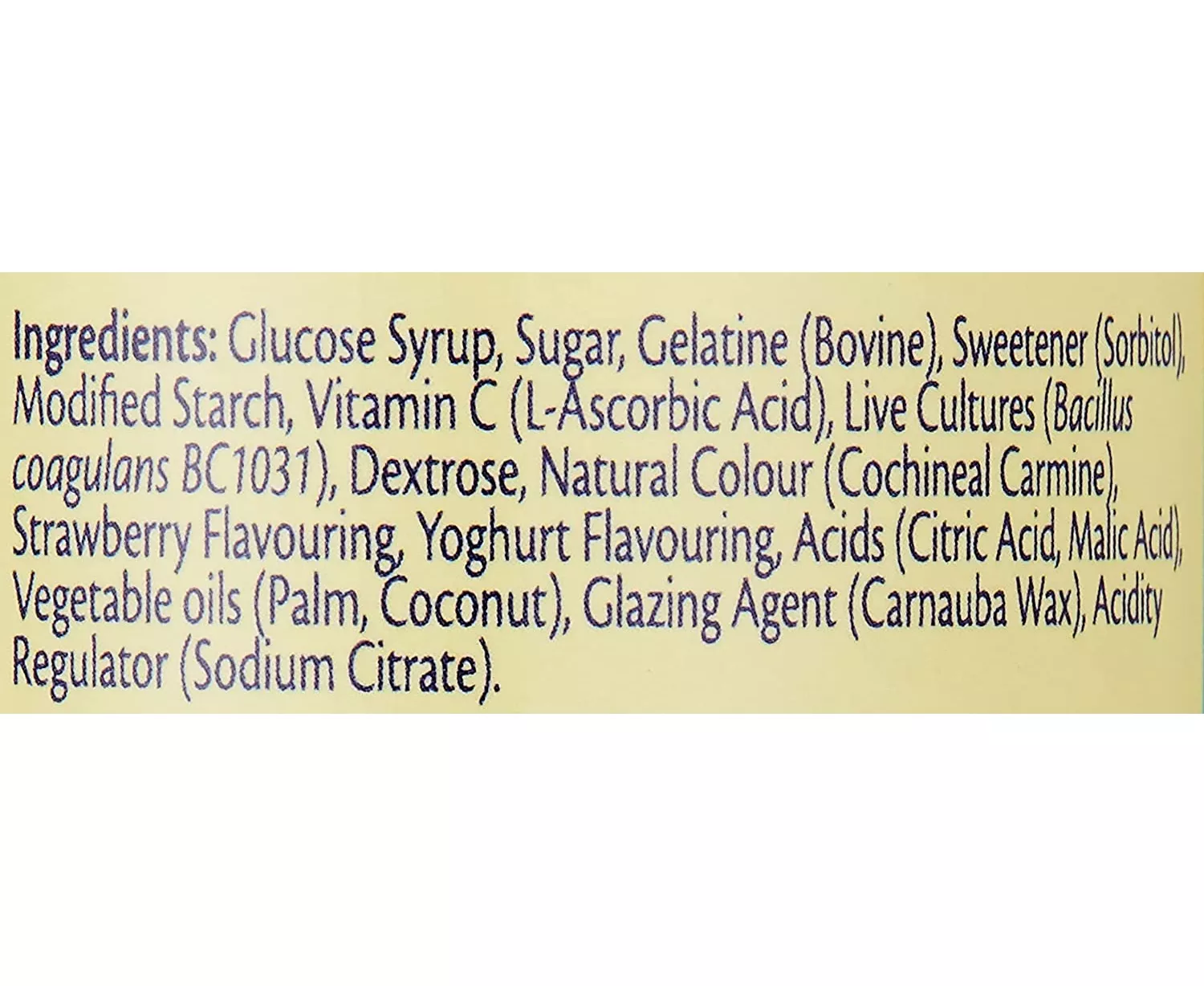 Glucose syrup, sugar, gelatine (bovine), sweetener (sorbitol), modified starch, vitamin c (l-ascorbic acid), live cultures (bacillus coagulans bc1031), dextrose, natural colour (cochineal carmine), strawberry flavouring, yoghurt flavouring, acids (citric acid, malic acid), vegetable oils (palm, coconut), glazing agent (carnauba wax), acidity regulator (sodium citrate).